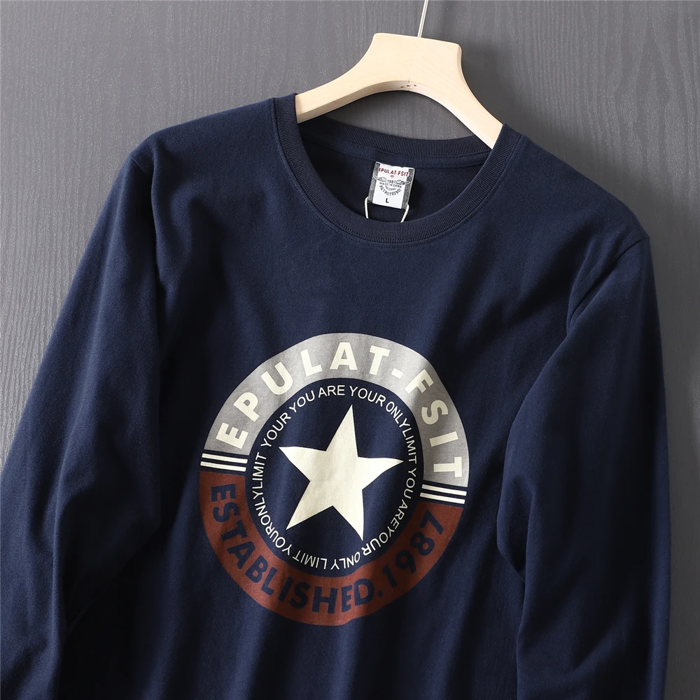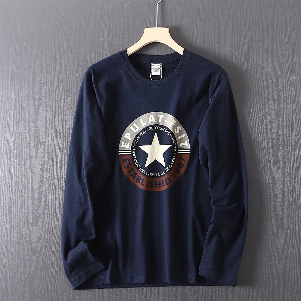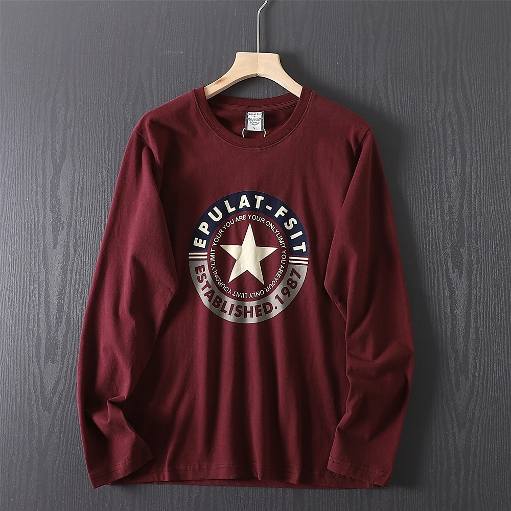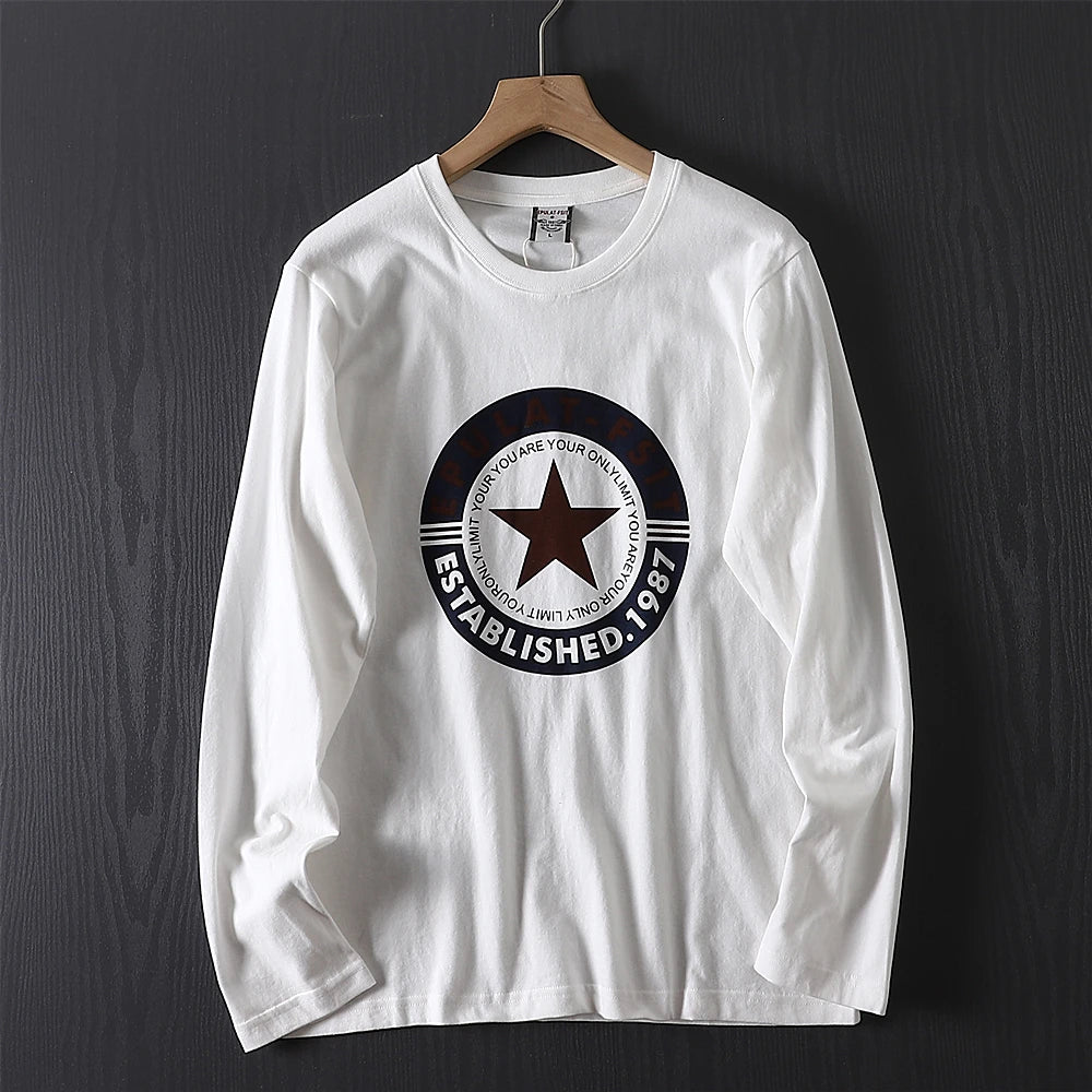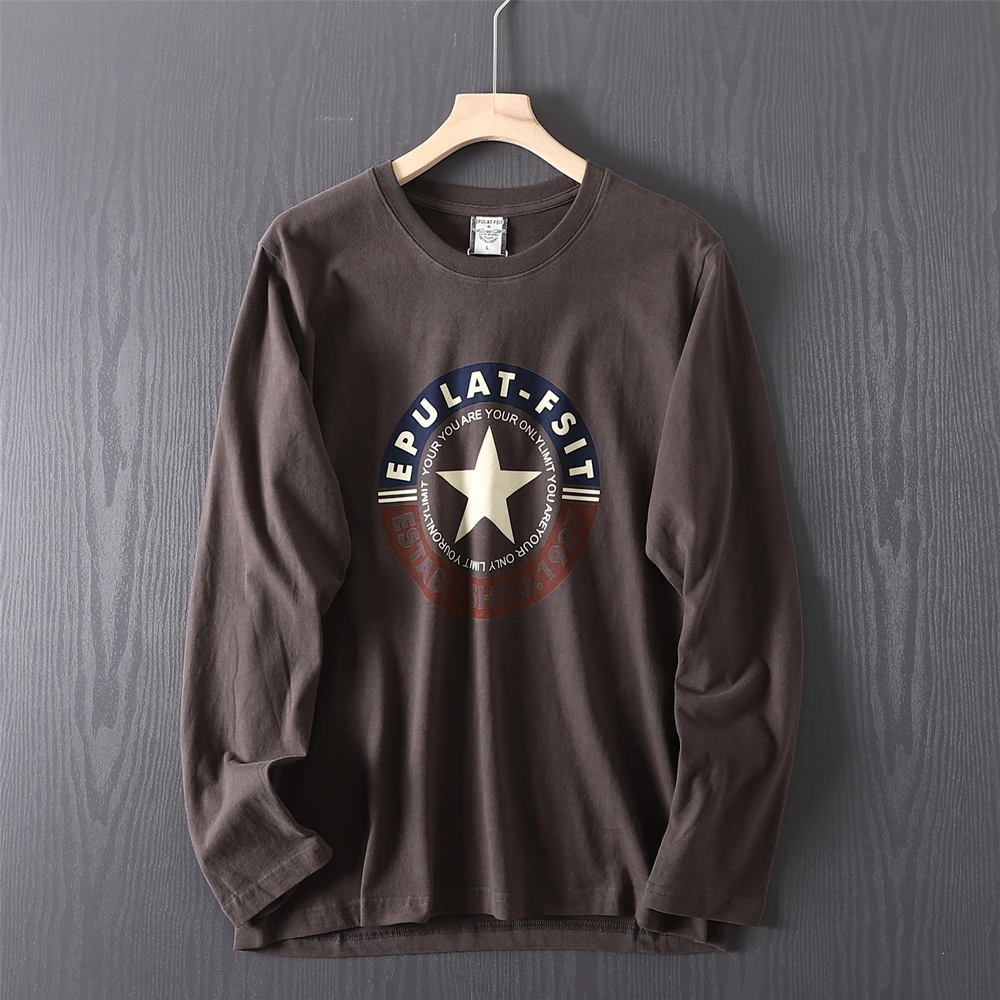 2025 Autumn New American Retro Long-sleeved O-neck Letter Printed T-shirt Men's Fashion 100% Cotton Washed Casual Sport Tops