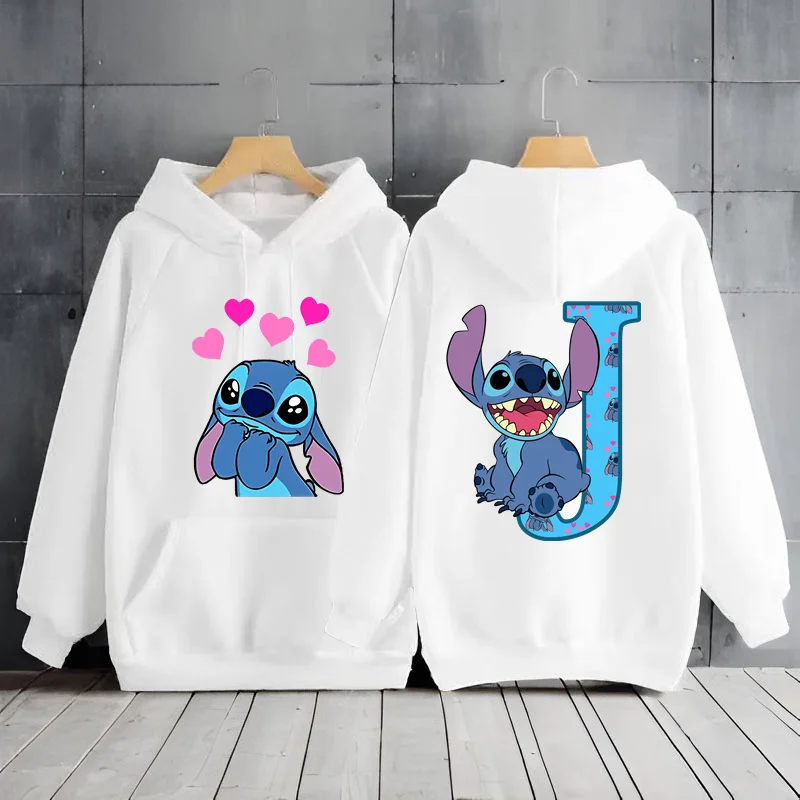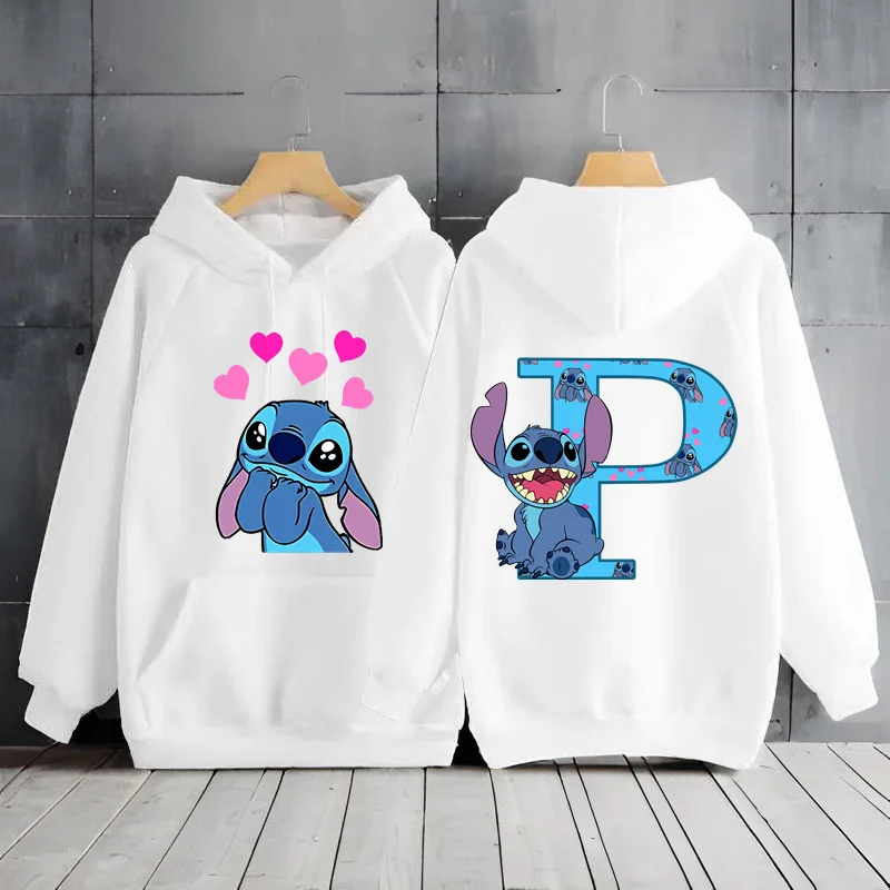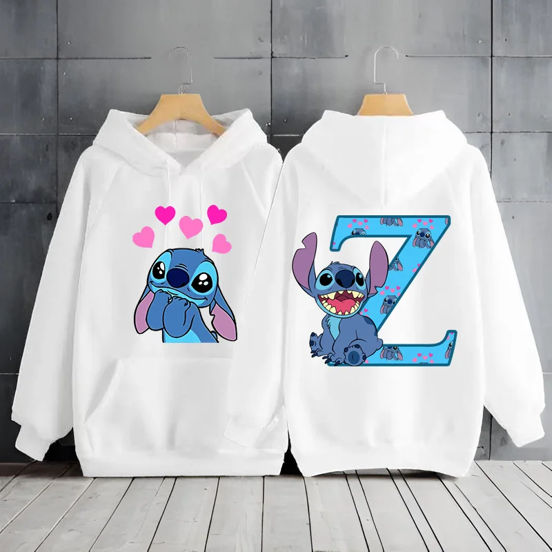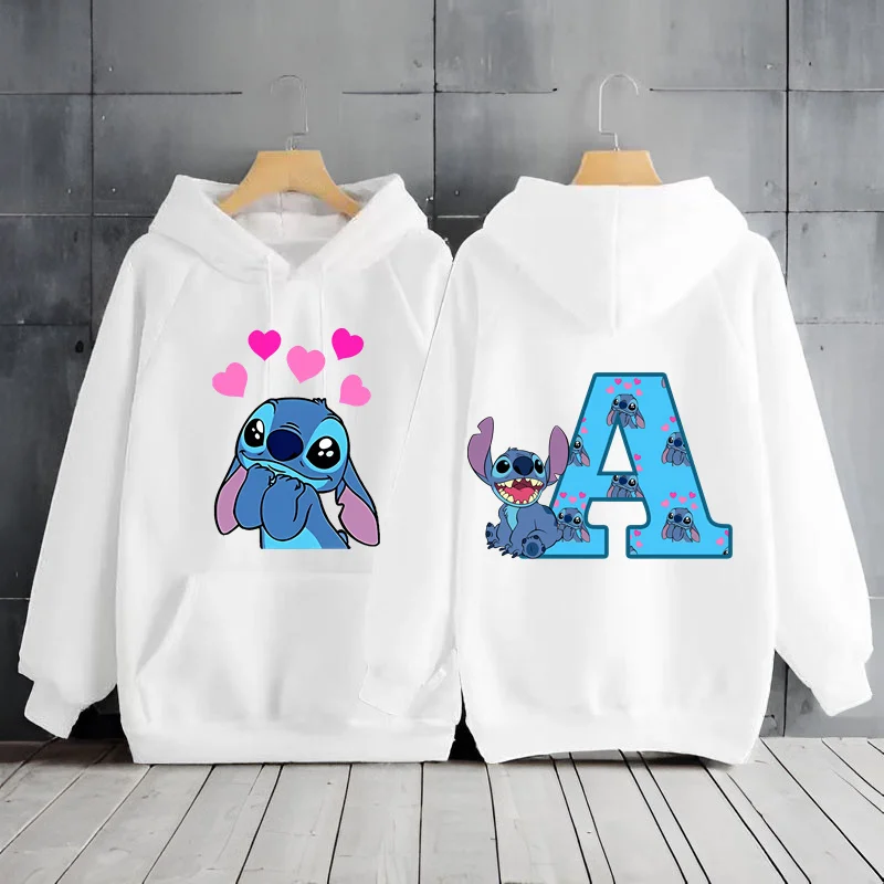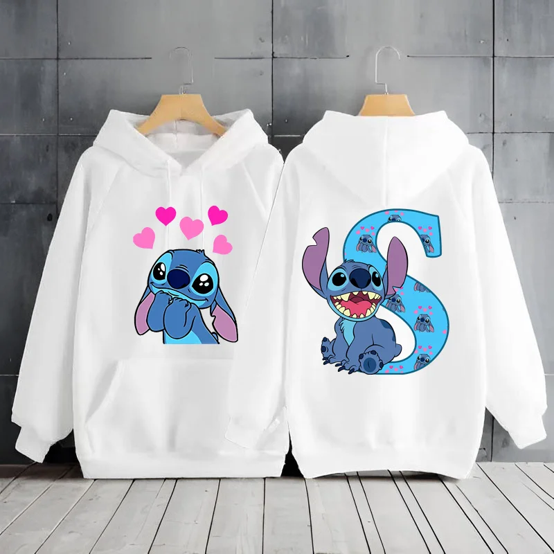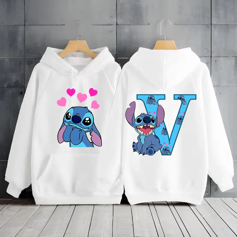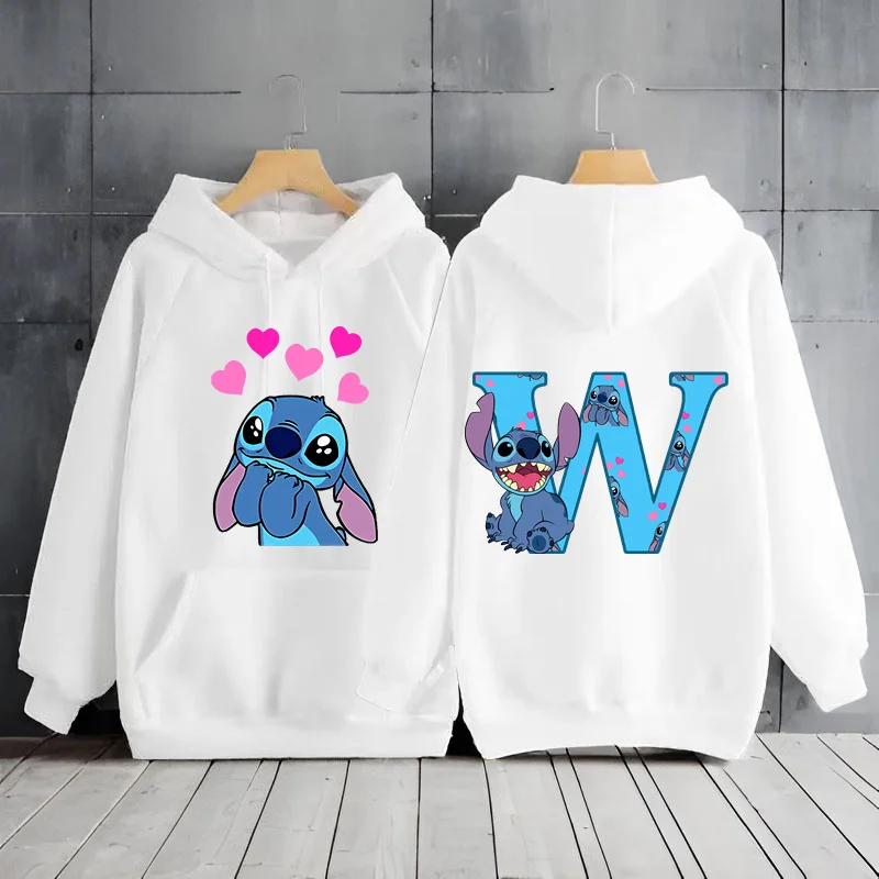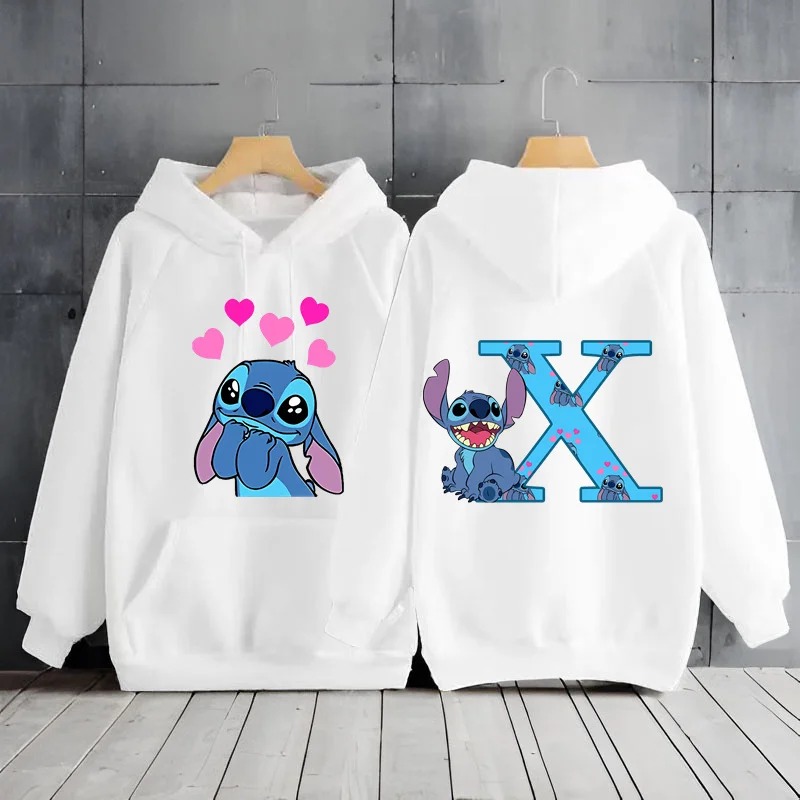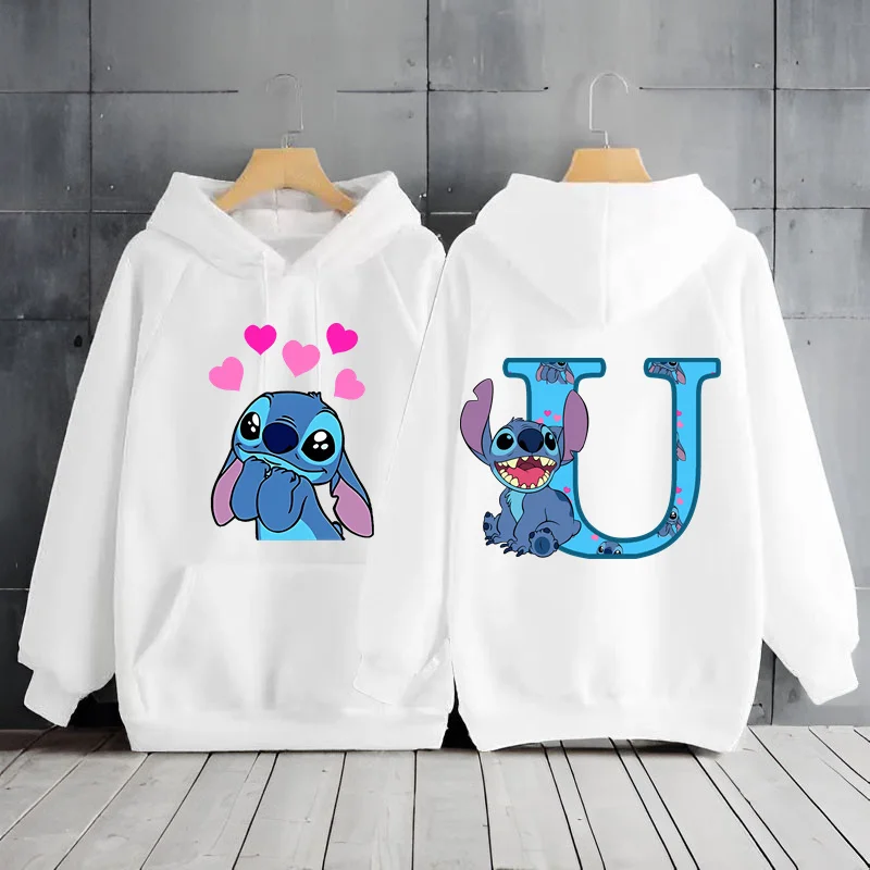 2025 Women's Winter Jacket Cute Kawaii Disney Lilo & Stitch Lucky Letter Print White Hoodie Fashion Couple Streetwear Sportswear