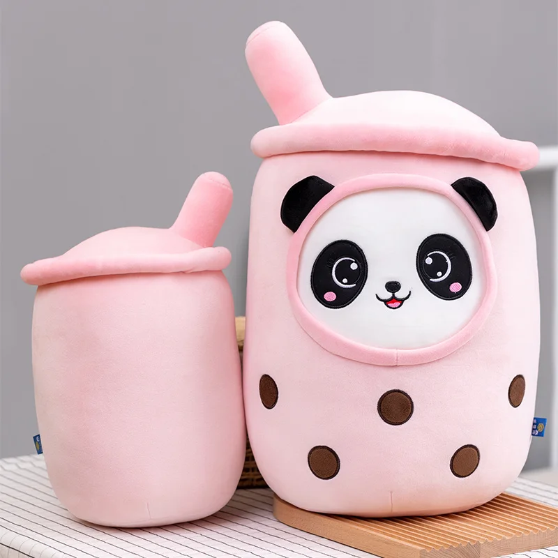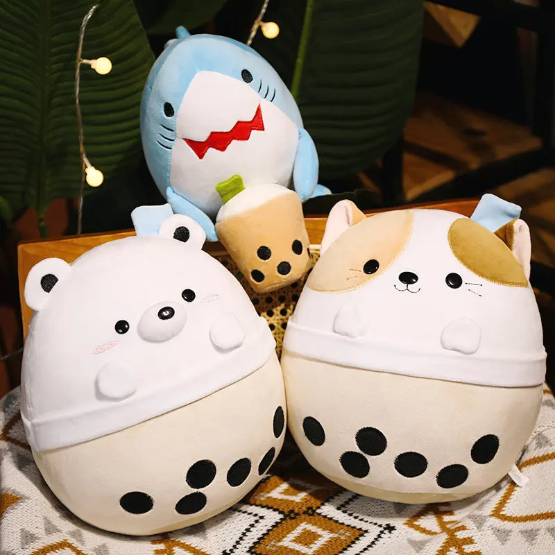 Cartoon Animals Shape Boba Stuffed Panda Polar Bear Shark Bubble Tea Plush Doll Hug Throw Pillow for Kids Round Ball Soft Drink