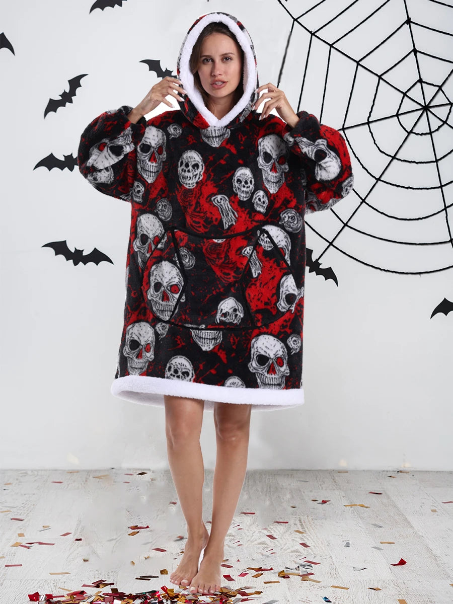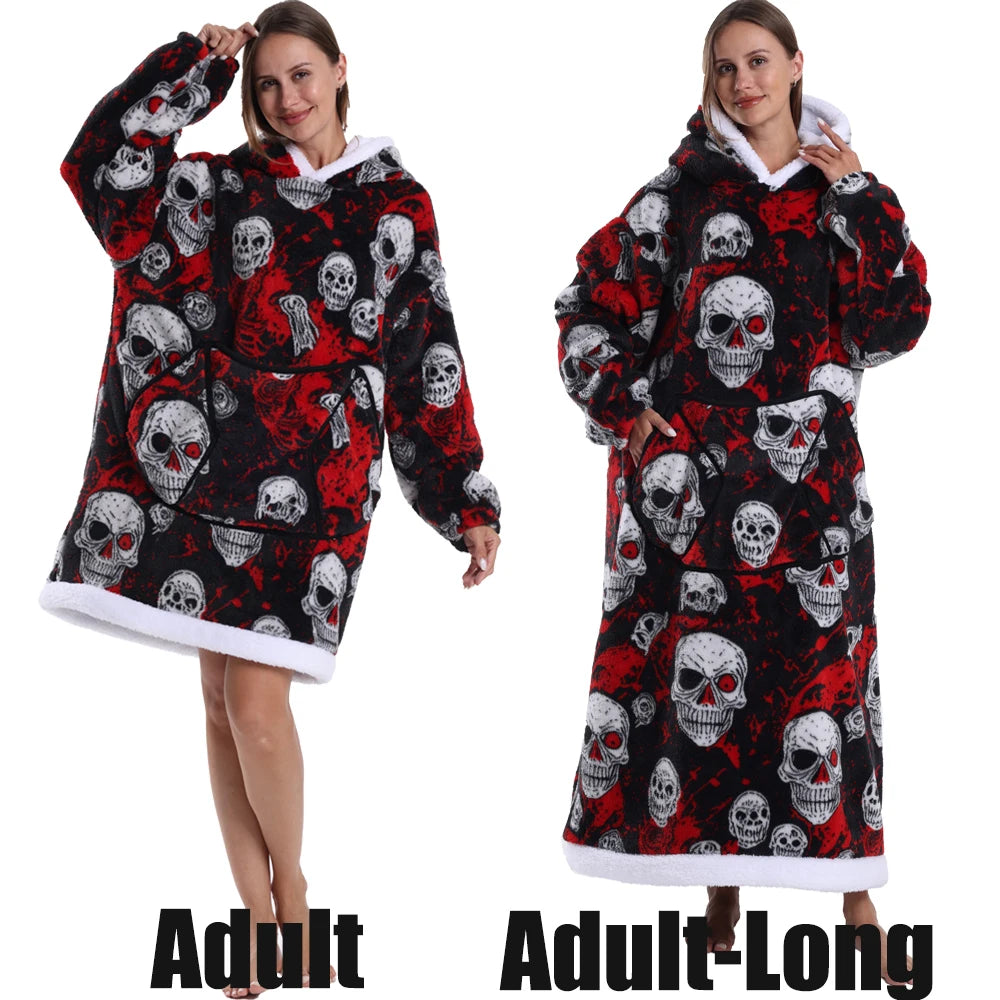 Short/Long Hoodie Blanket for Adults Winter Soft Thicken Warm Wearable Blanket Hoodie with Sleeves Halloween Pajamas for Couples