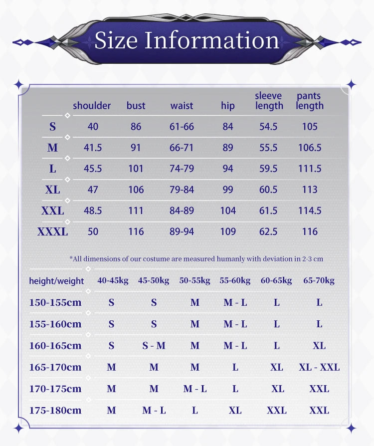 Please read the size chart carefully. (◕ˇ∀ˇ◕)Welcome contact us for help about size choosing with your height ,weight ,waist ,bust,hip measurement.