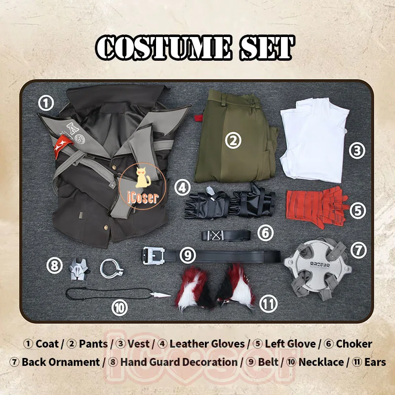 Components: Top,Pants,trench,Headgear,Glove,Necklace,Belt,Ears