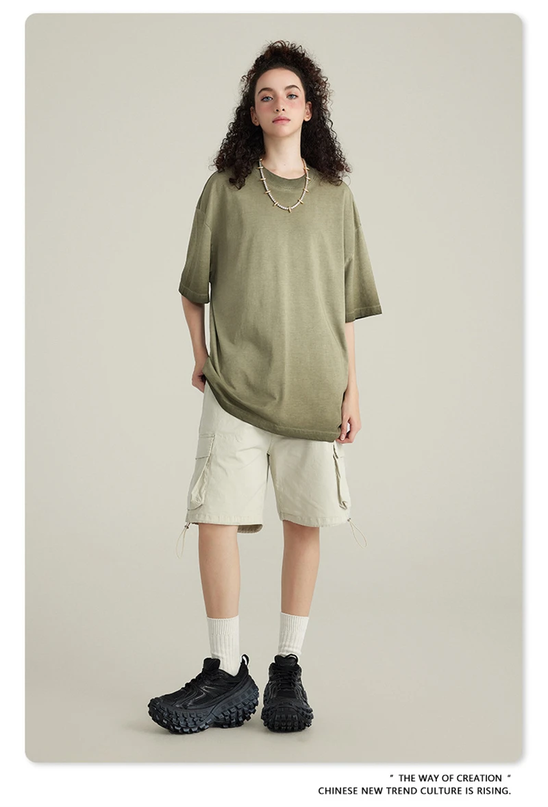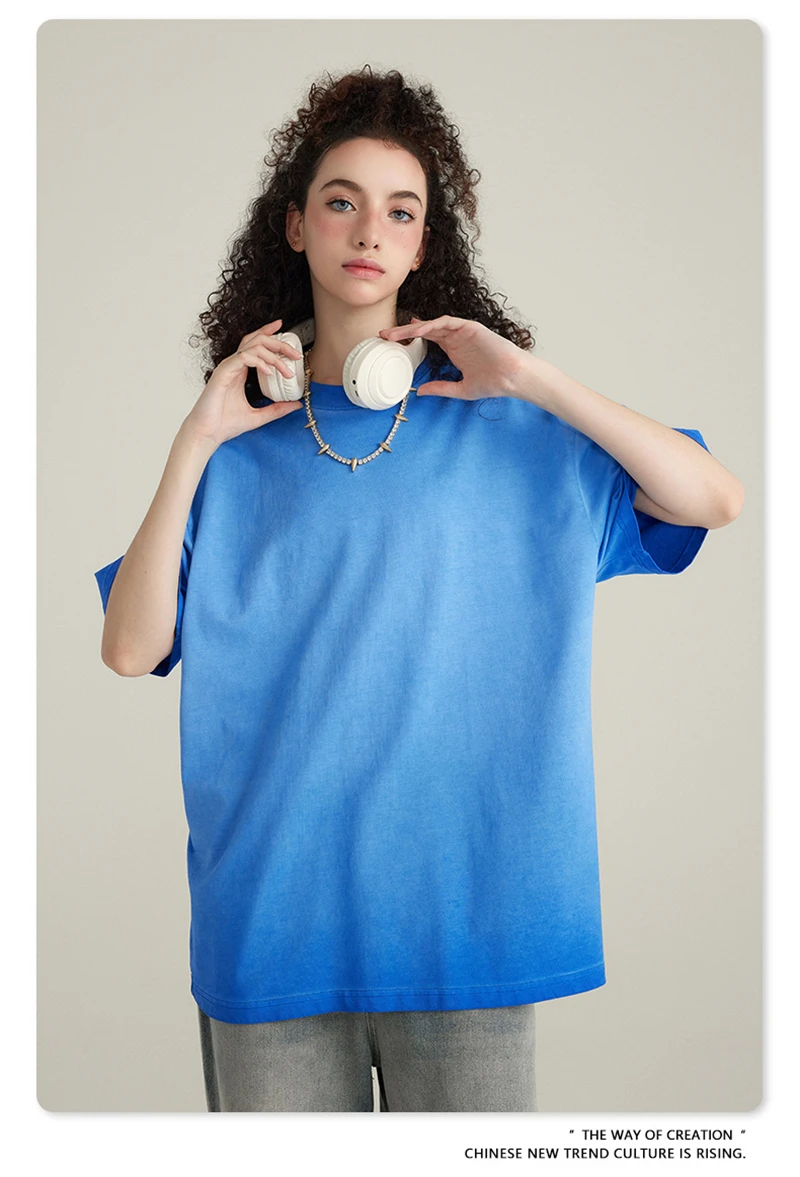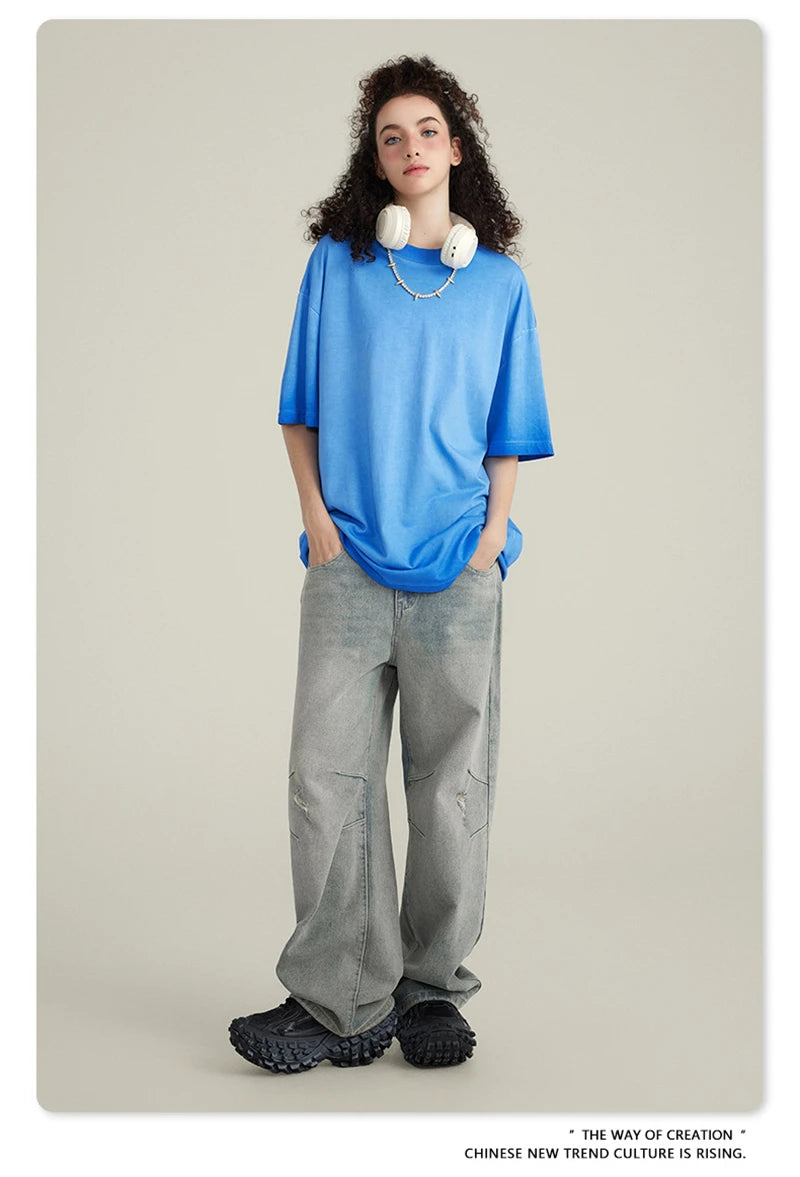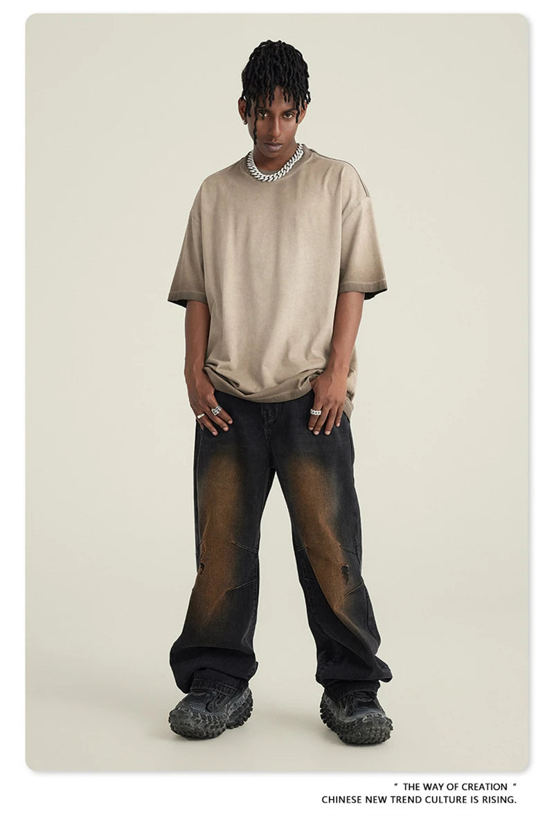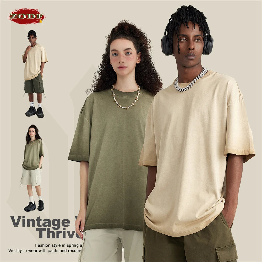 ZODF 2023 Men's Summer 255G Wash Gradient Fried Cotton T Shirt Round Neck Short Sleeve American Retro Loose T-Shirt HY0547