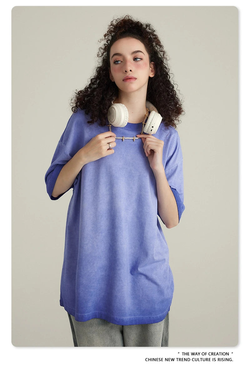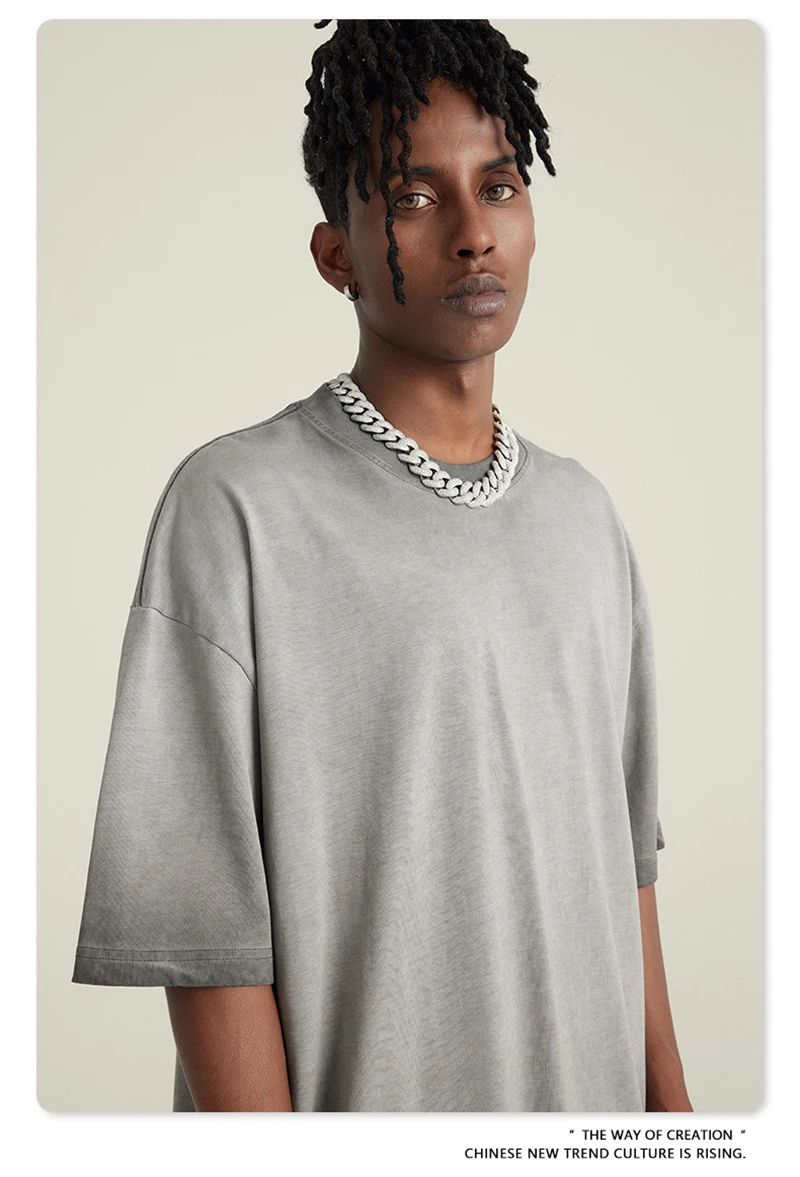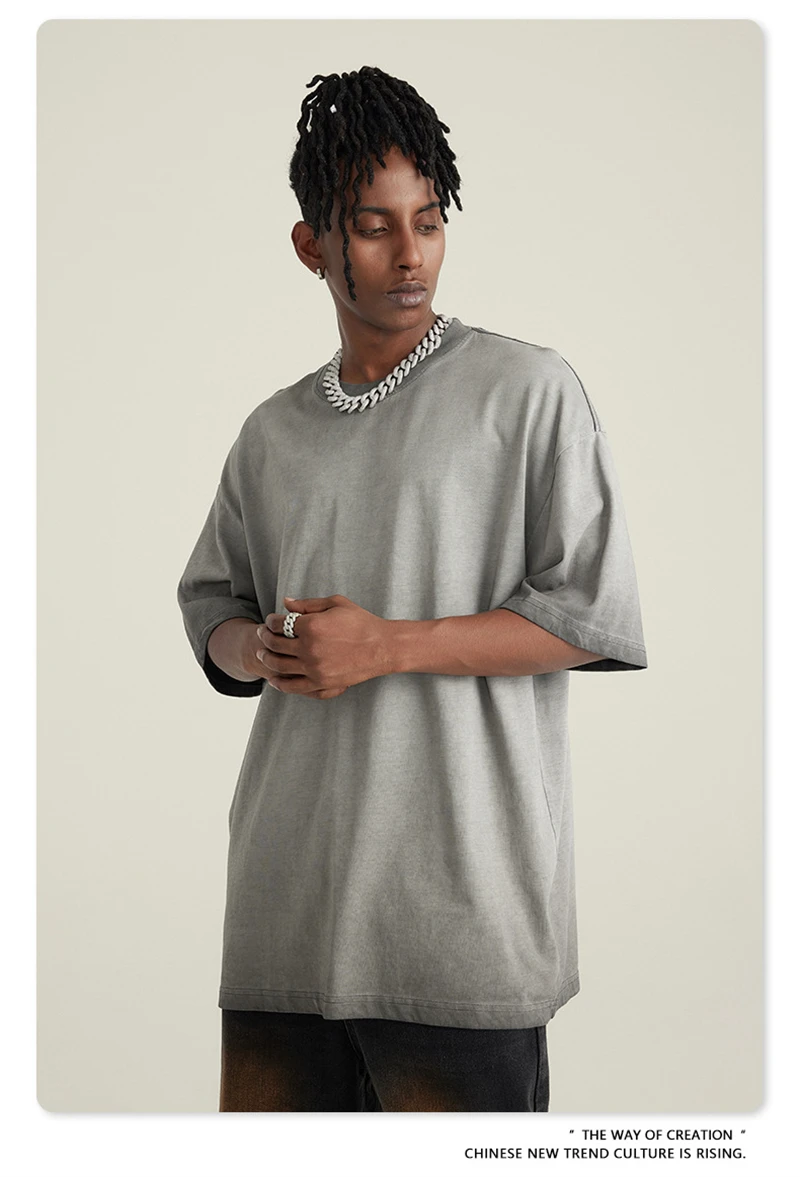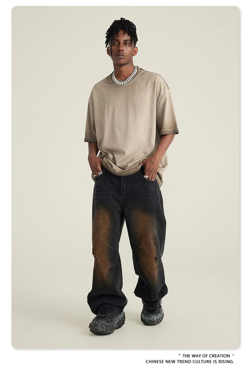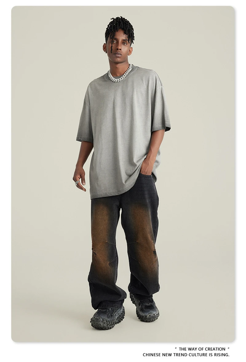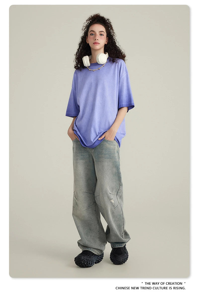 ZODF 2023 Men's Summer 255G Wash Gradient Fried Cotton T Shirt Round Neck Short Sleeve American Retro Loose T-Shirt HY0547