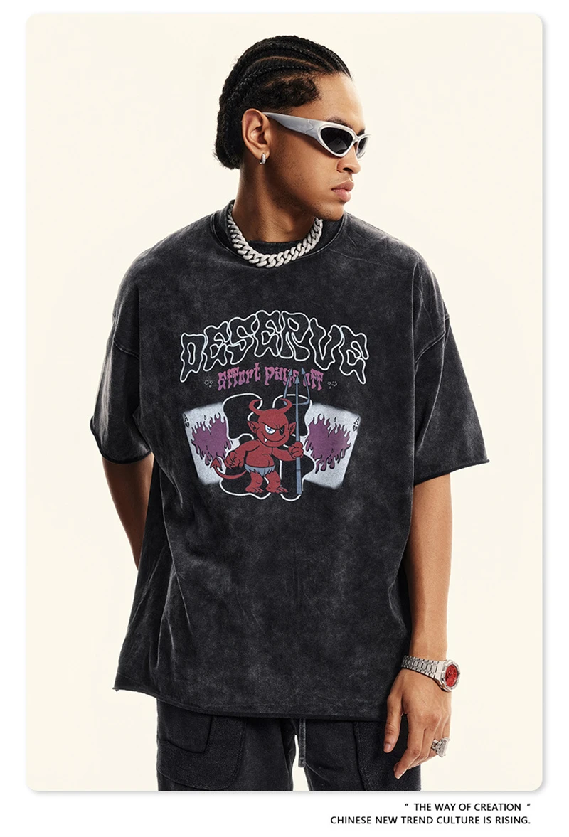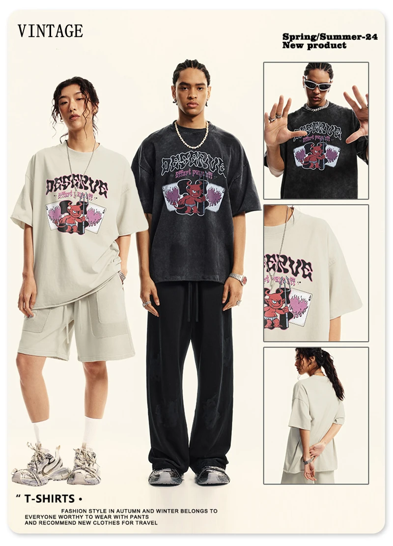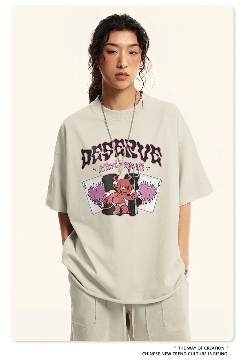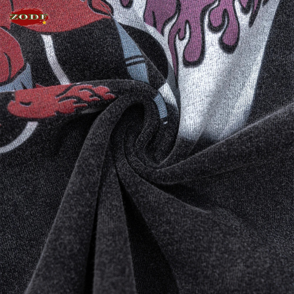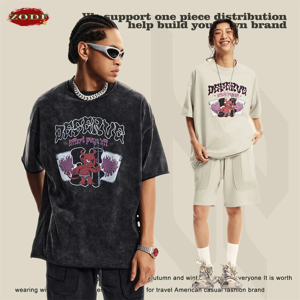 ZODF America Retro Summer 100% Cotton T-Shirts For Men Unisex Washed 310gsm Comfortable High Street Printing T Shirt Tops HY0862