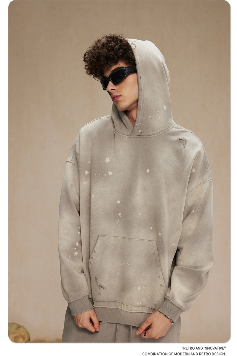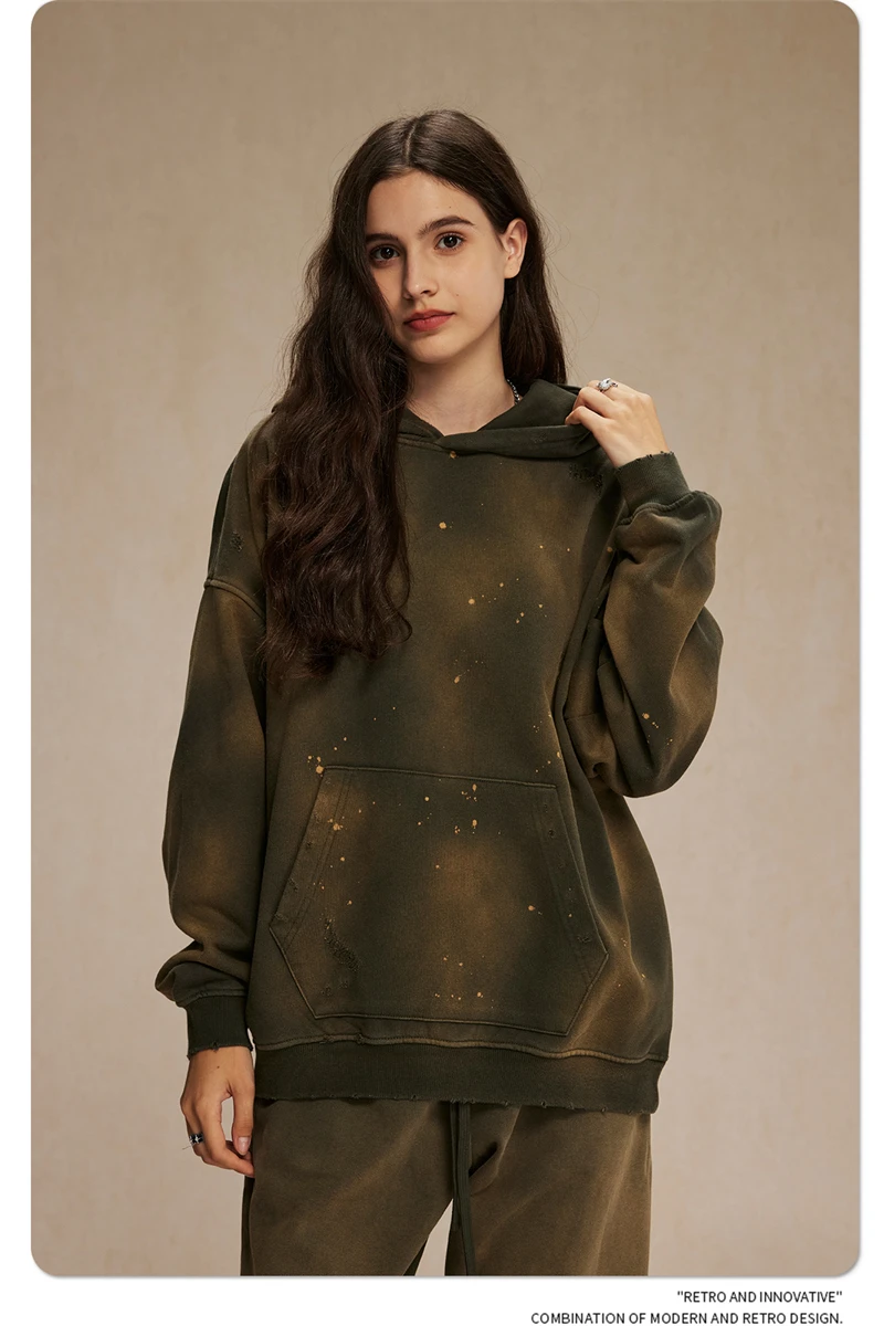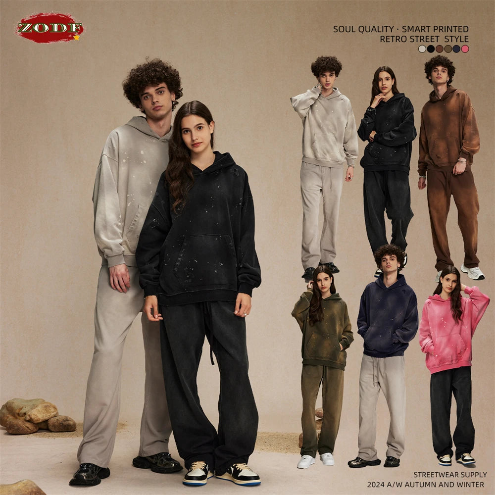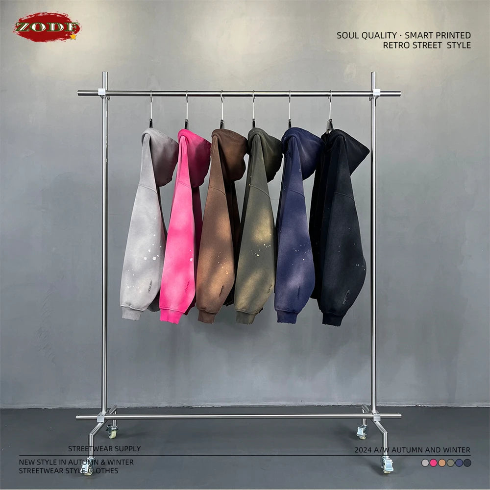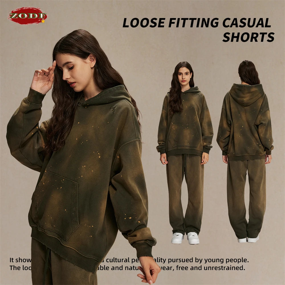 ZODF Autumn Winter Spray Dyeing Ink Splashing Hoodies For Men Unisex 450gsm Washed Oversized Knitted Hooded Pullovers HY0908