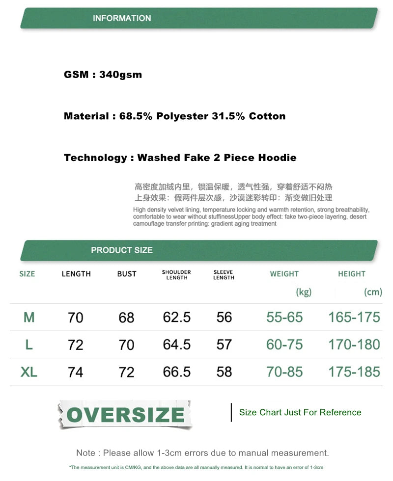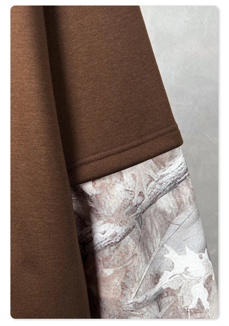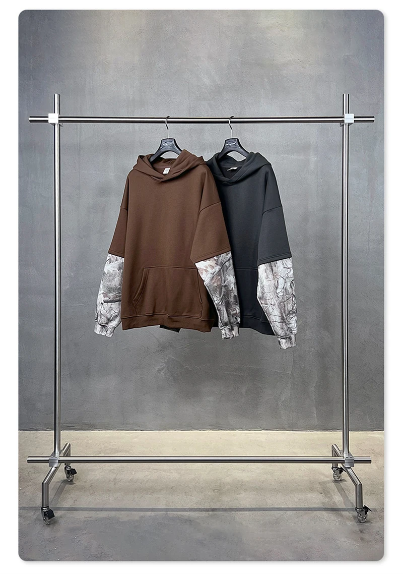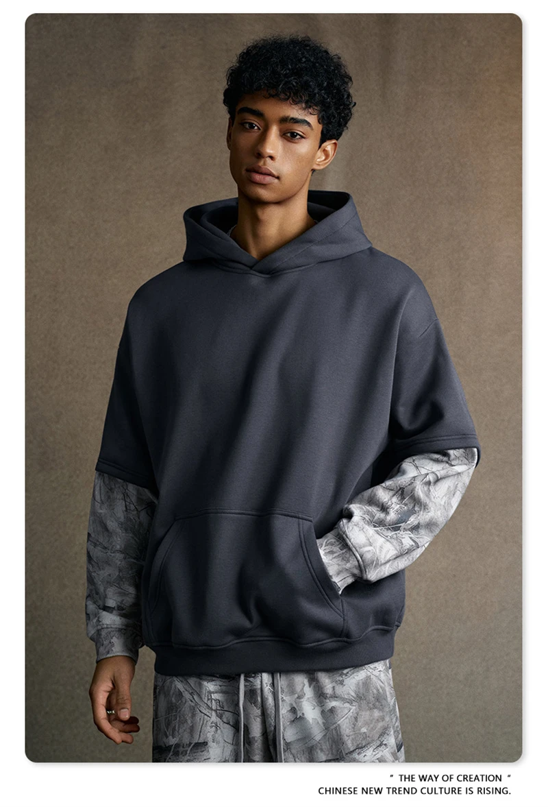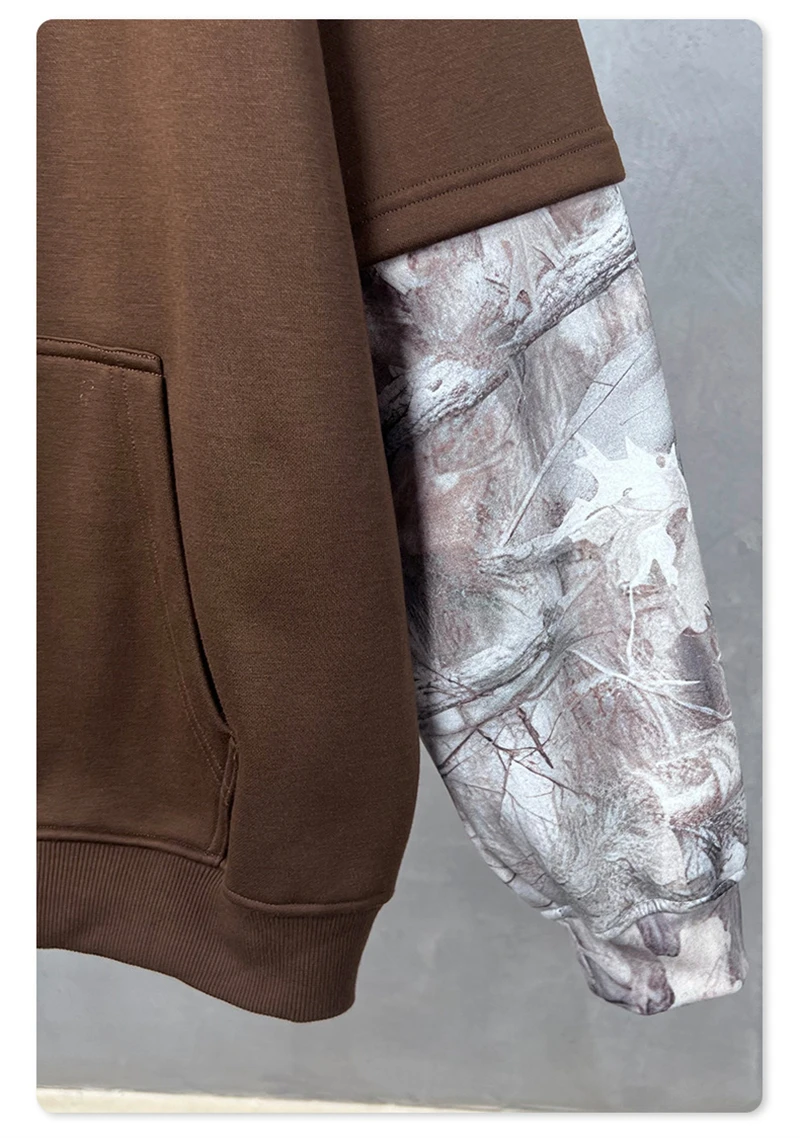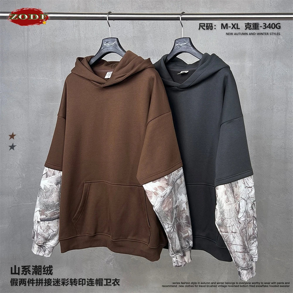 ZODF Fashion Winter Fake 2-Piece 340gsm Fleece Hoodies For Men Unisex High Street Camouflage Sleeve Hooded Pullovers HY1153