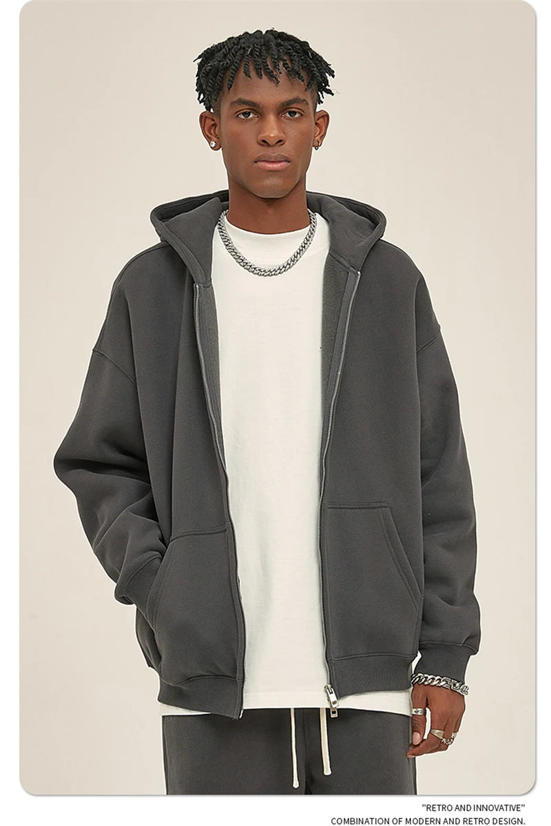 ZODF New Men Double Headed Zipper Fleece Hoodies Unisex Loose Basic Solid Warm Hooded Sweatshirts Coats For Winter HY0633