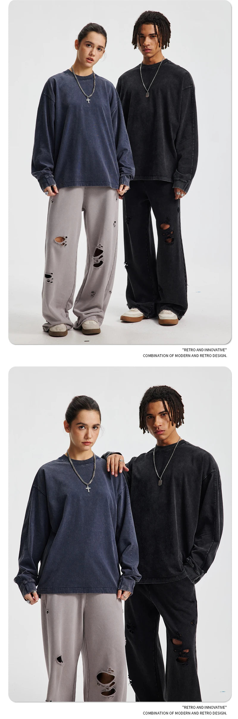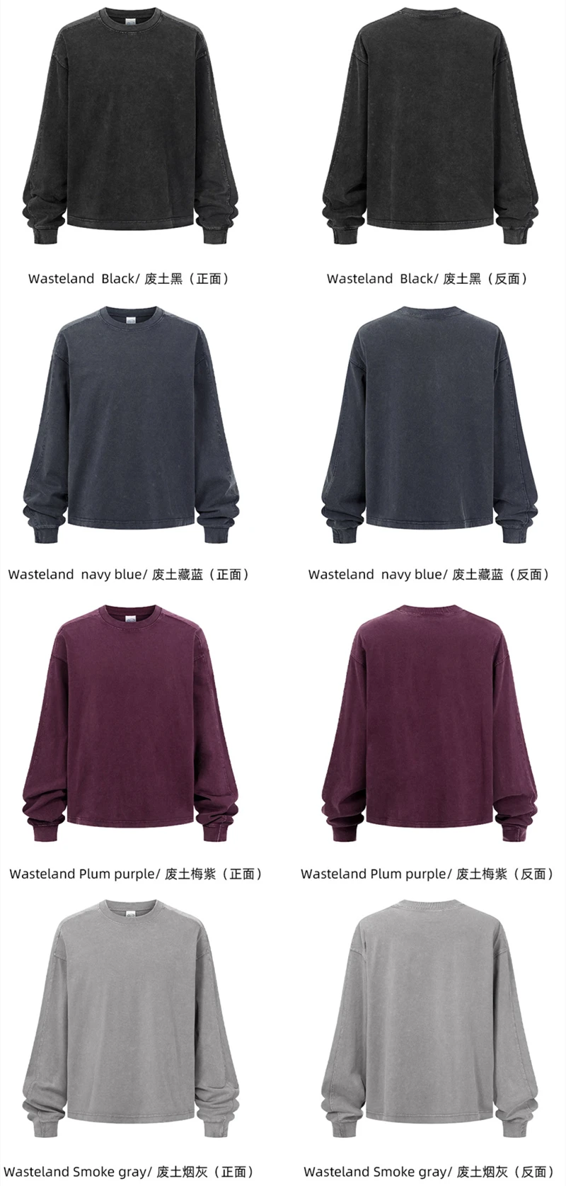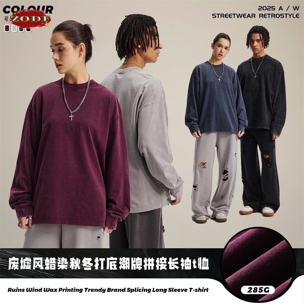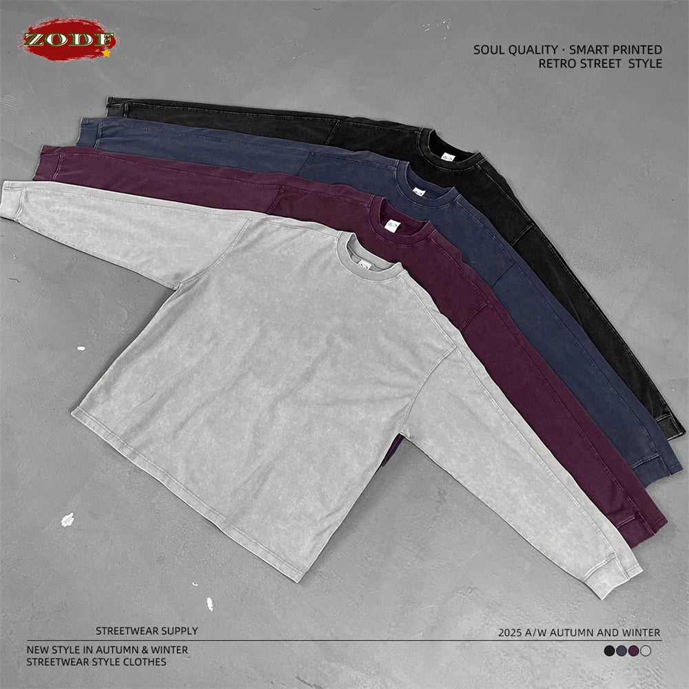 ZODF Retro 285gsm Batik Washed Cotton Man's T-Shirts Unisex Solid Loose Distressed Patchwork Full Sleeve Tee Shirt Tops HY1161