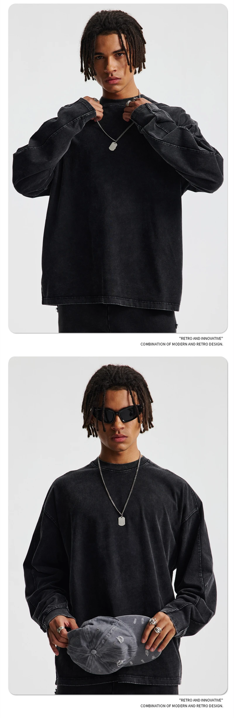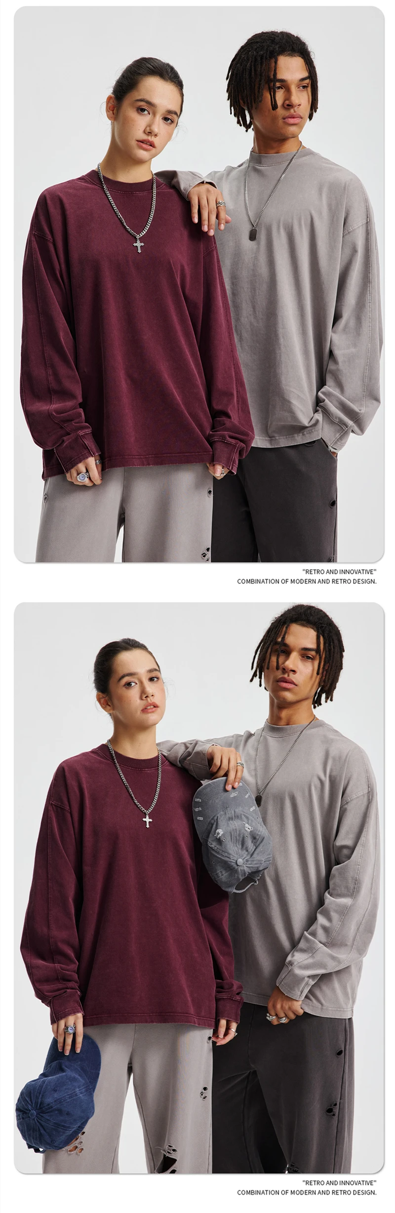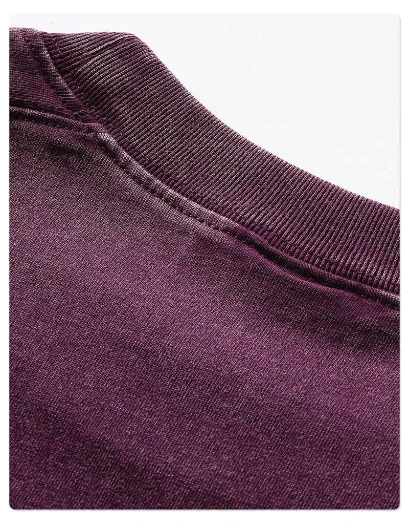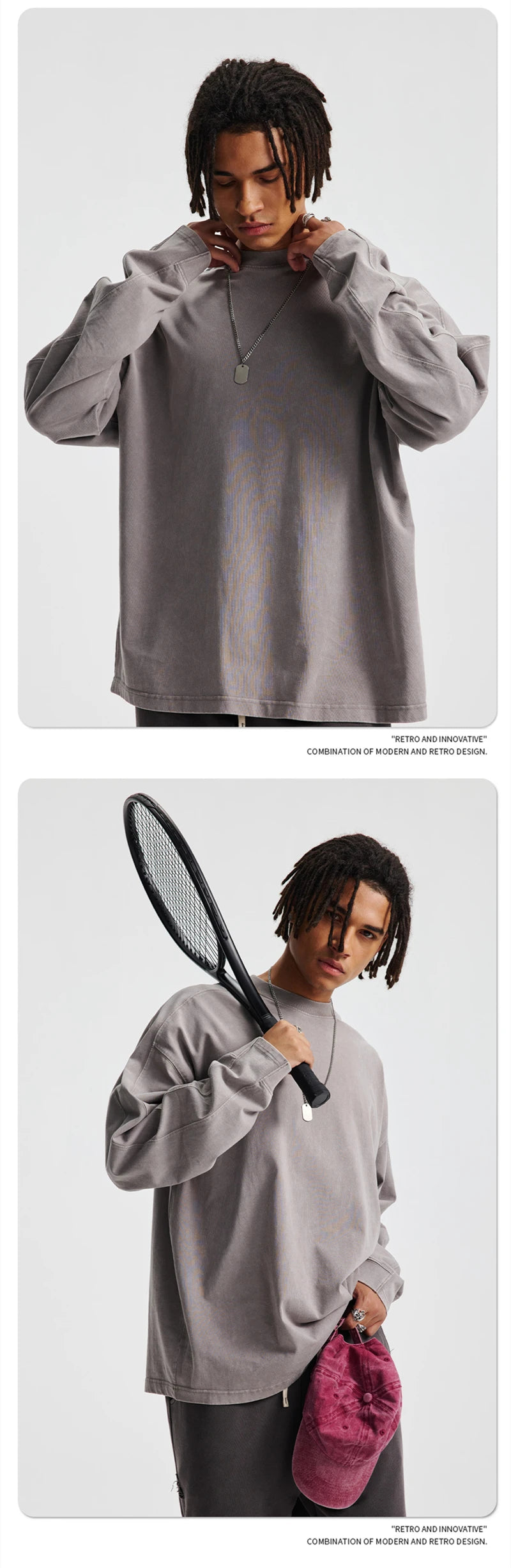 ZODF Retro 285gsm Batik Washed Cotton Man's T-Shirts Unisex Solid Loose Distressed Patchwork Full Sleeve Tee Shirt Tops HY1161