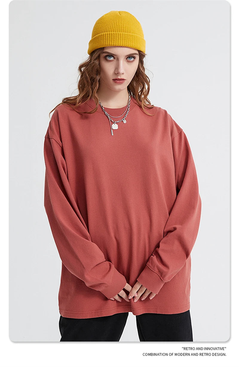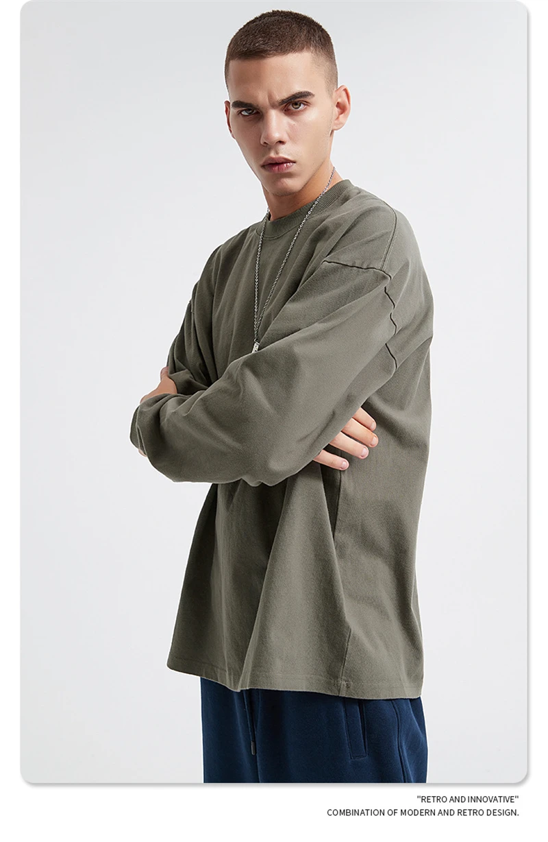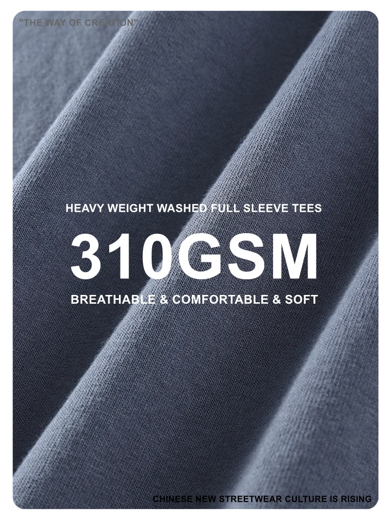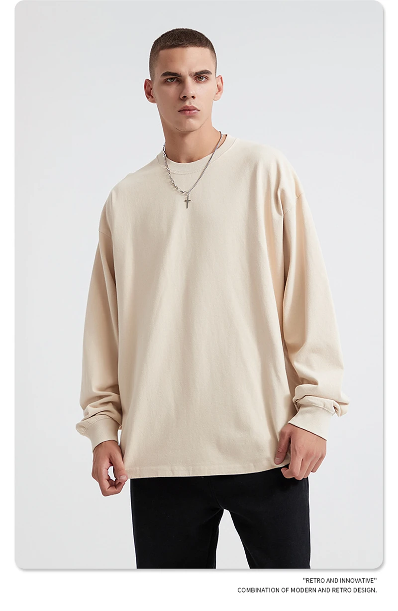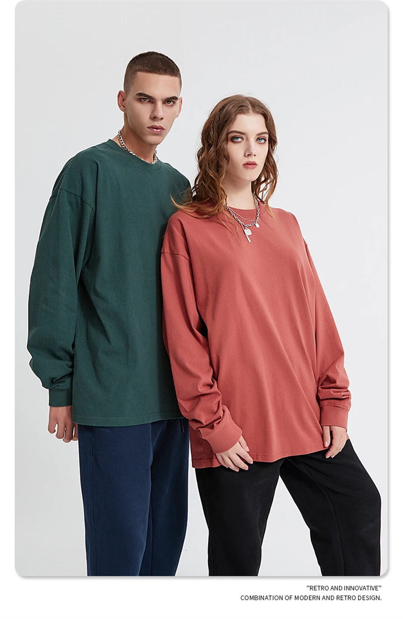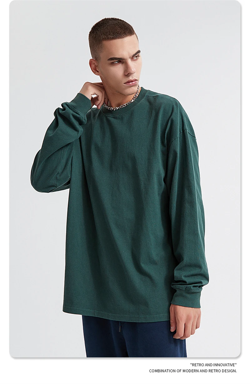 ZODF Retro Autumn Full Sleeve Washed 100% Cotton T-Shirts For Men Unisex Solid Casual Loose 310gsm Tee Brand Tops HY0405