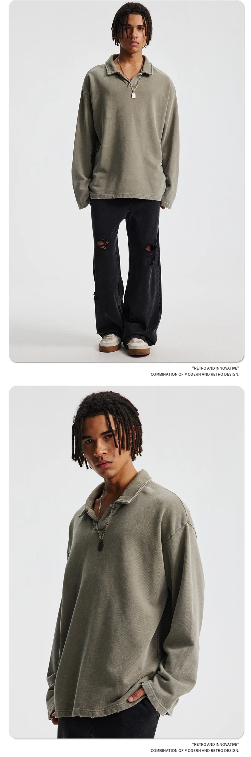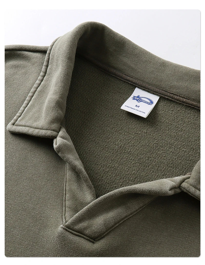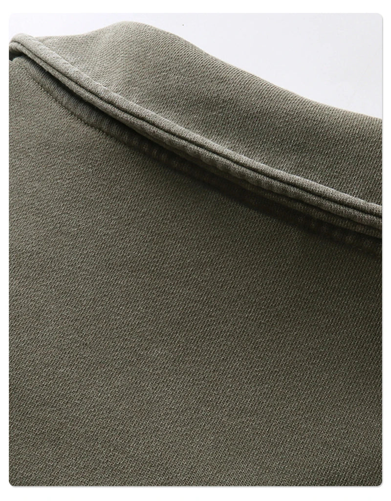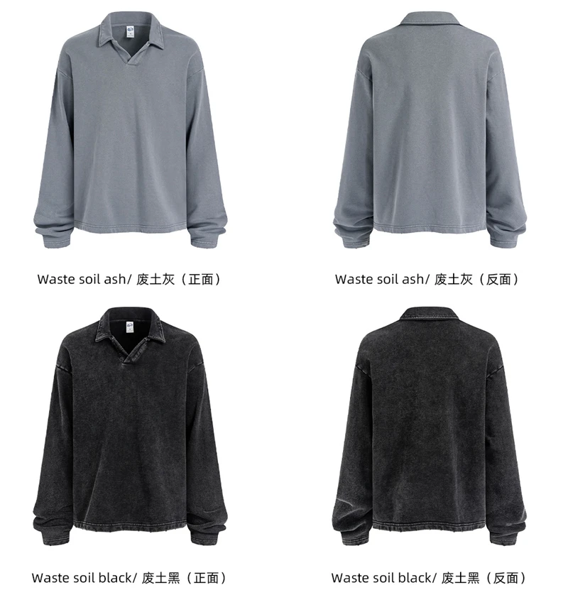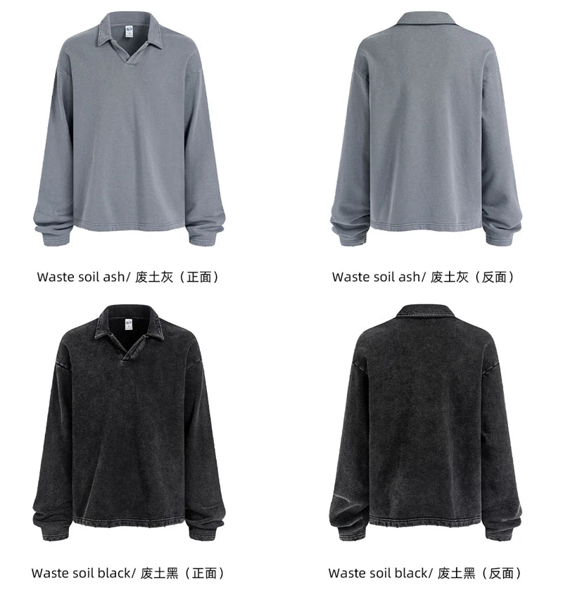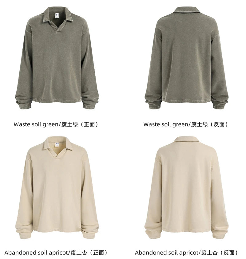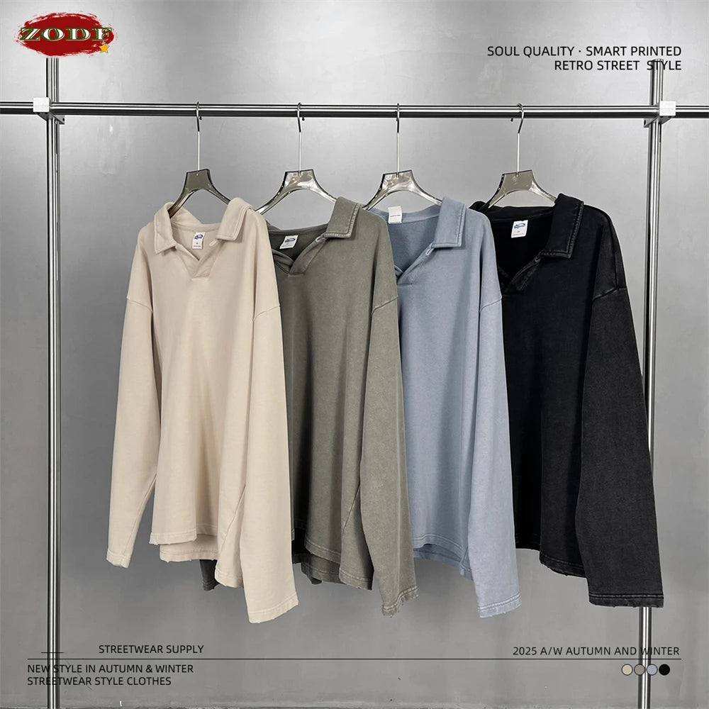 ZODF Retro Heavy Weight 400gsm Washed Cotton T-Shirts For Man Unisex Full Sleeve Turn Down Collar T Shirt Brand Tops HY1087