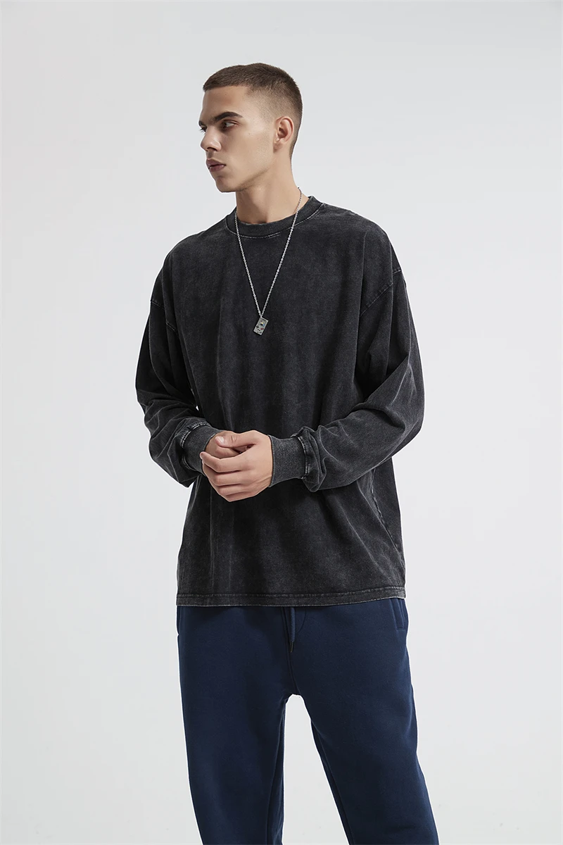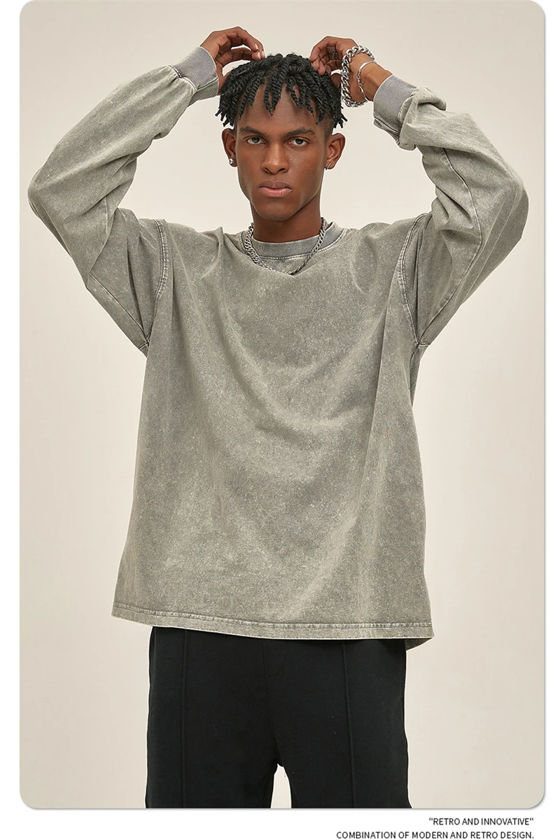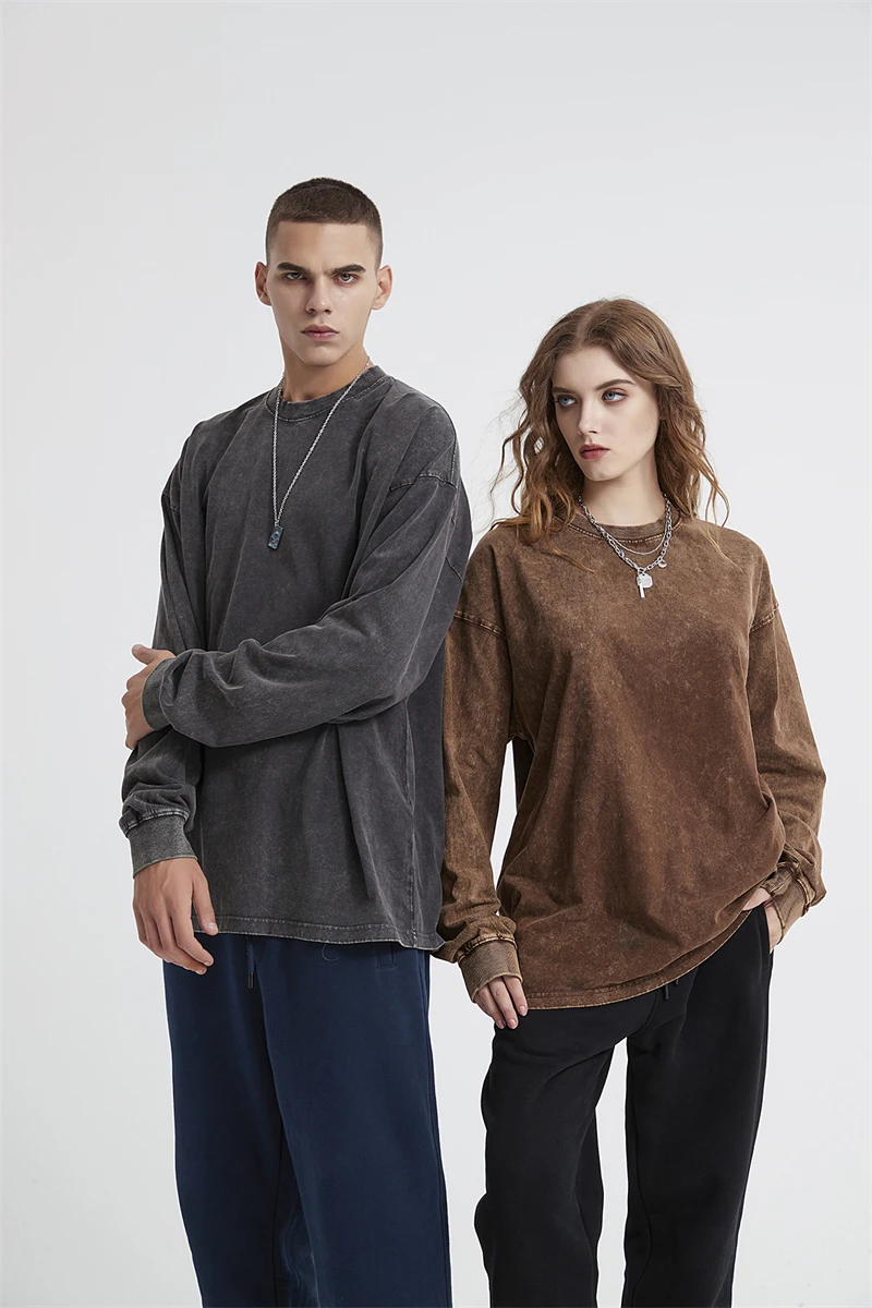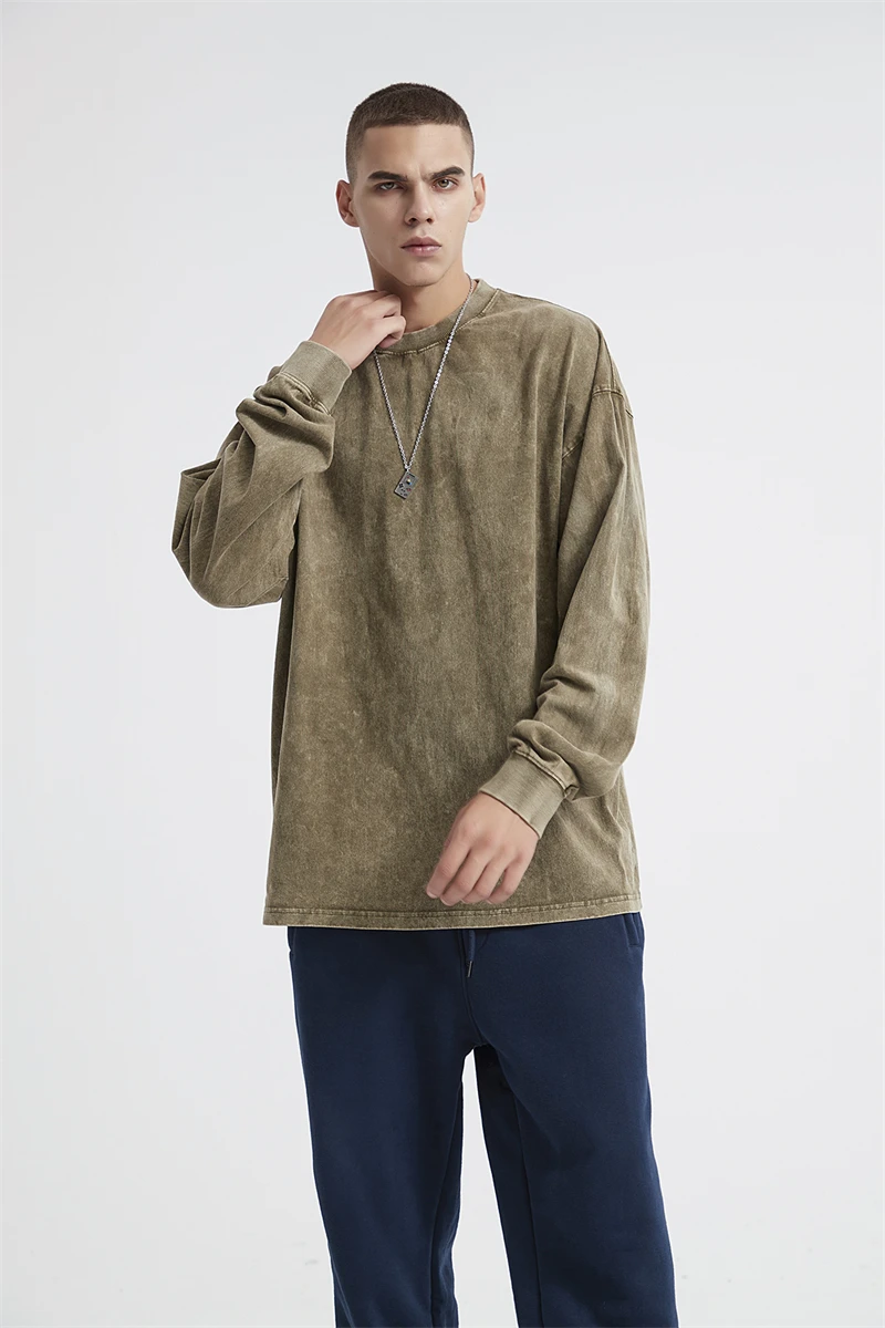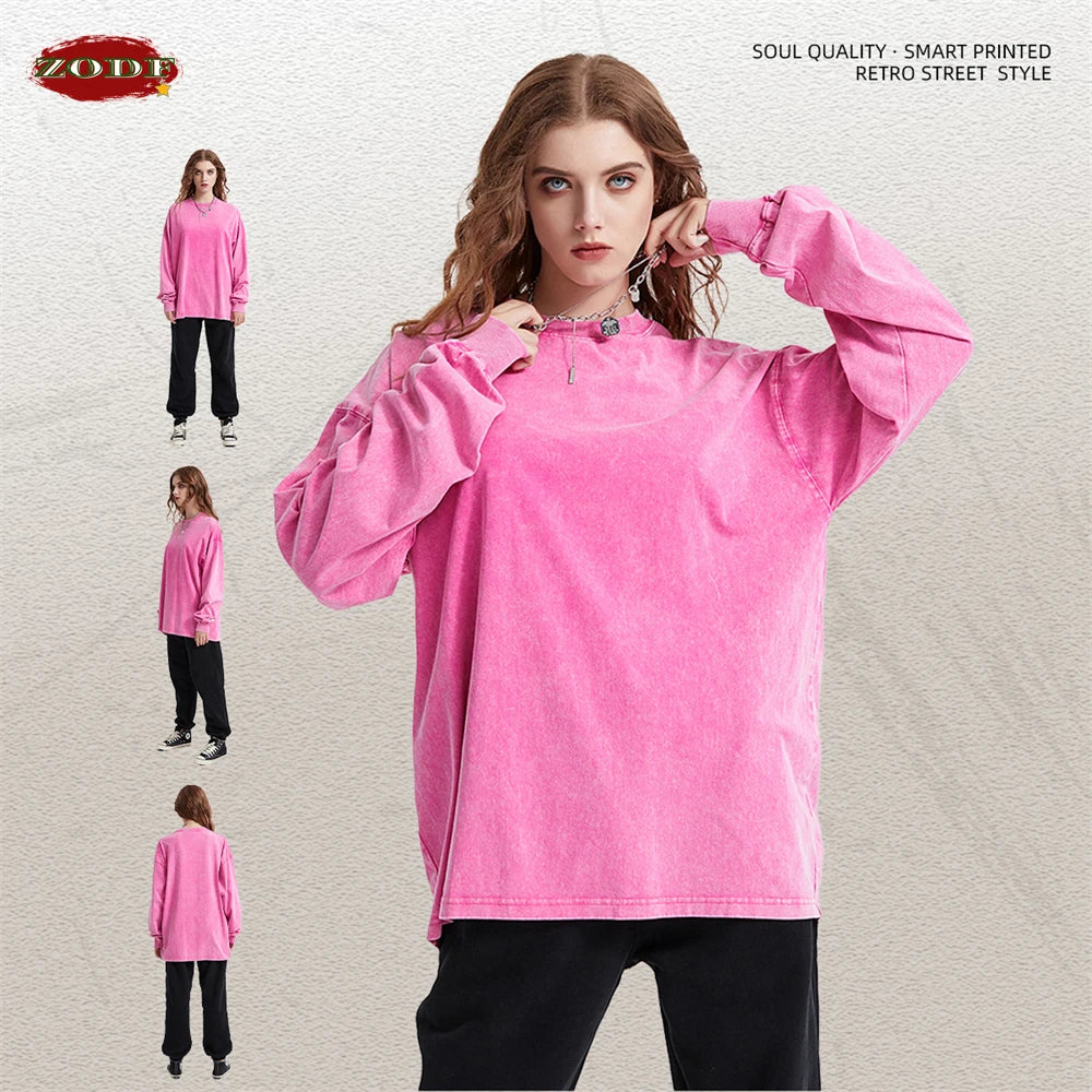 ZODF Retro Men Long Sleeve Washed Cotton T Shirt Unisex Loose 250gsm Basic Atumn TEES Tops Brand Streetwears HY0394