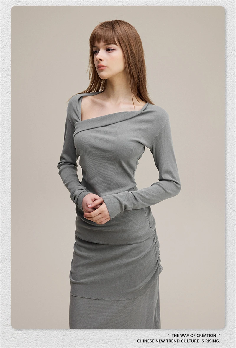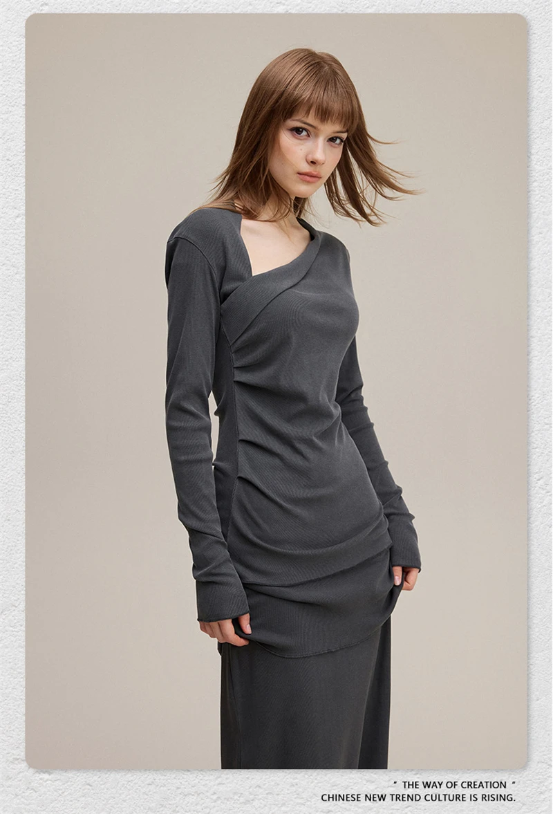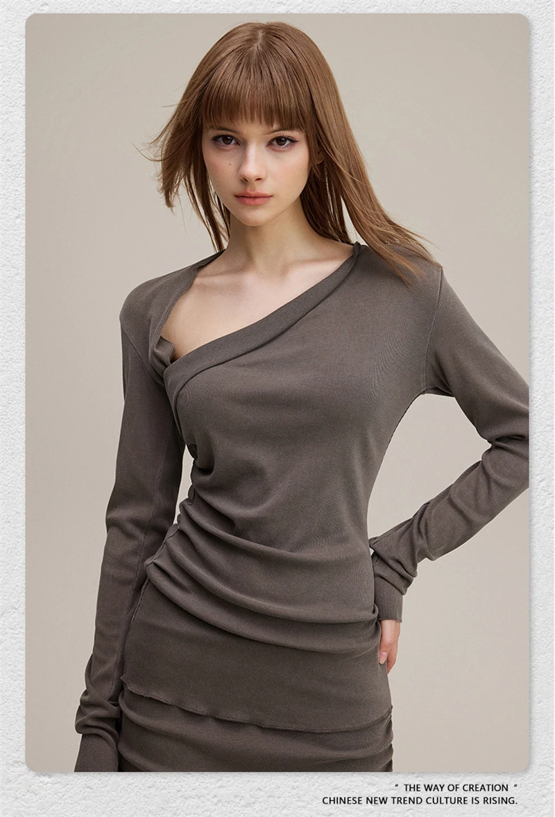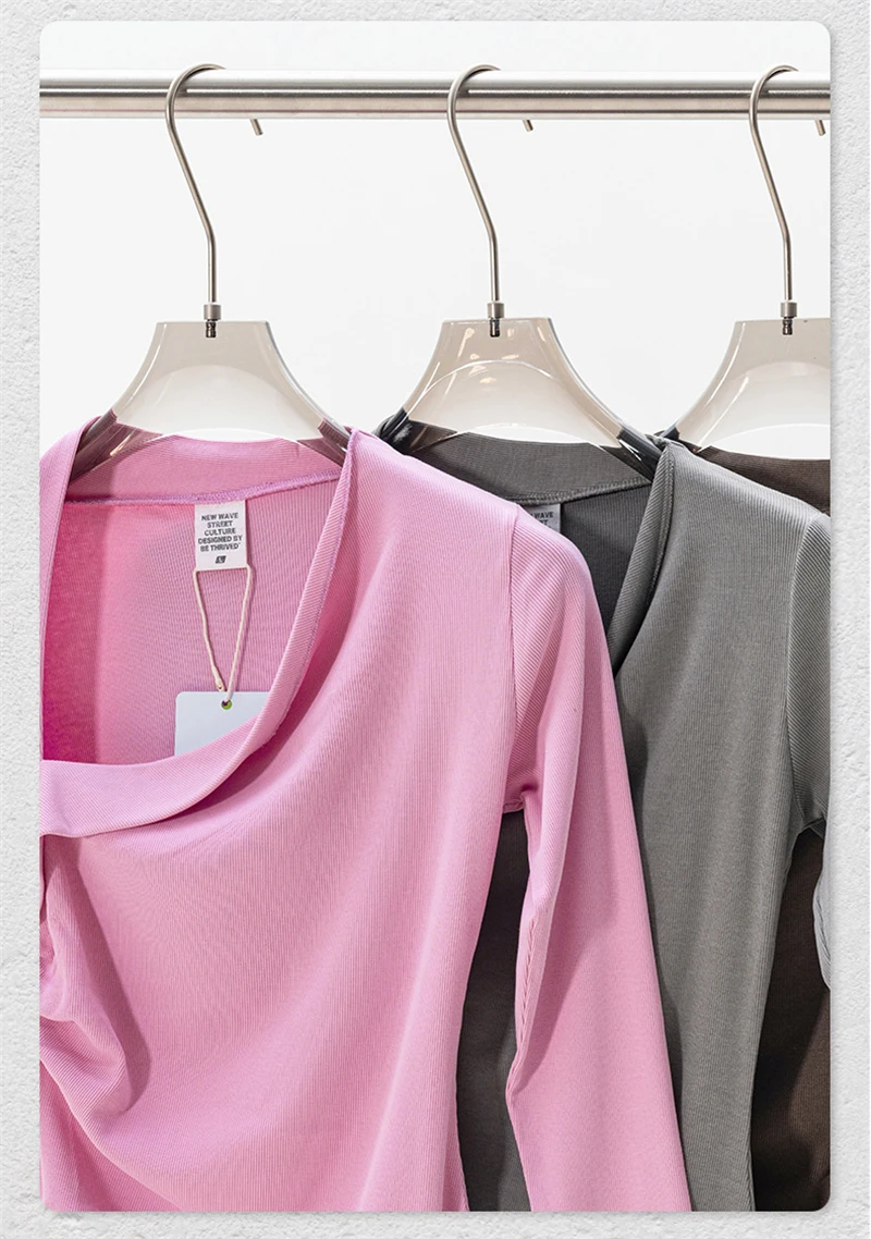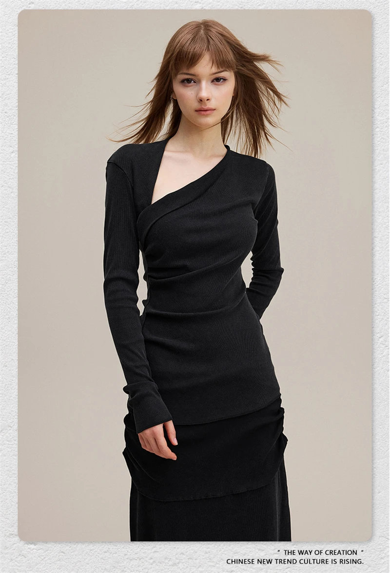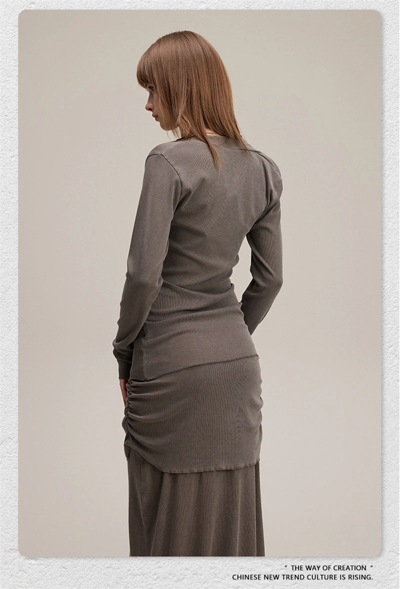 ZODF Retro Sexy Women Autumn Washed 275gsm T Shirt Ladies Girls Distressed Side Pleated Full Sleeve T-Shirts Tees HY1107