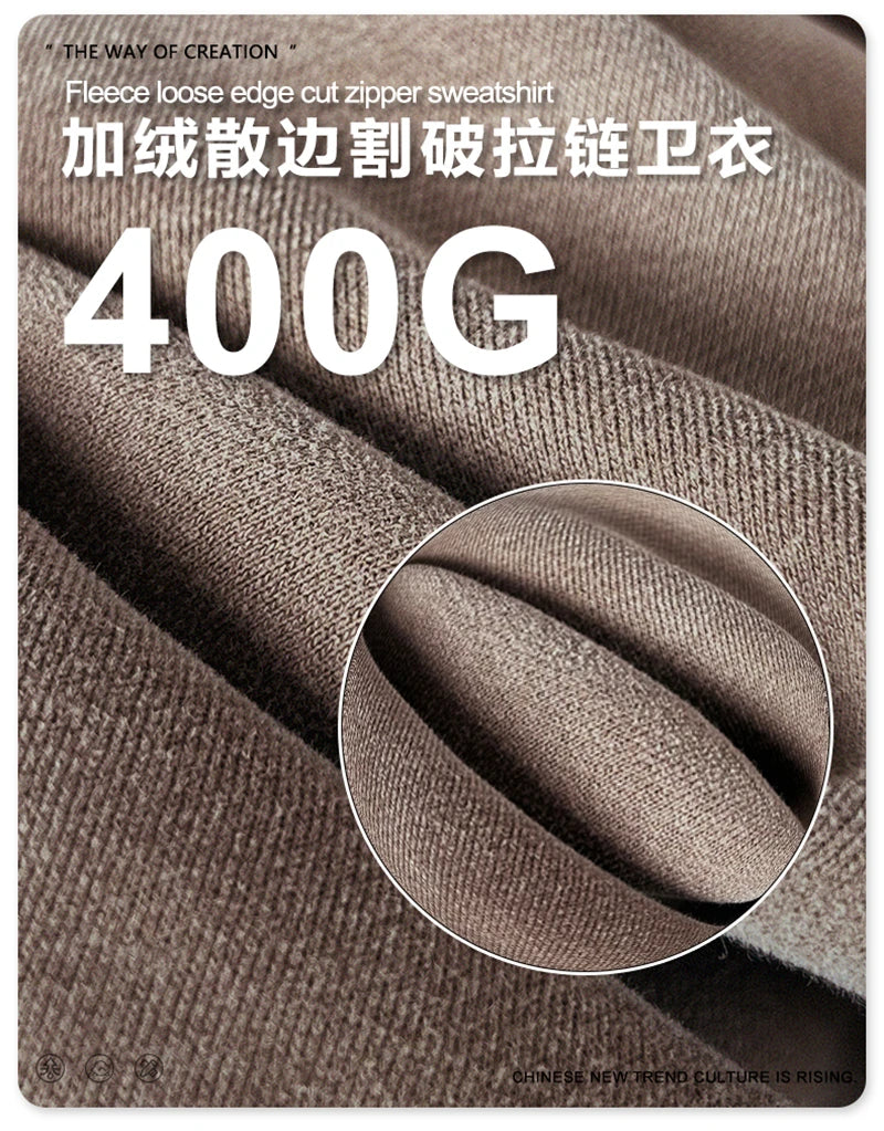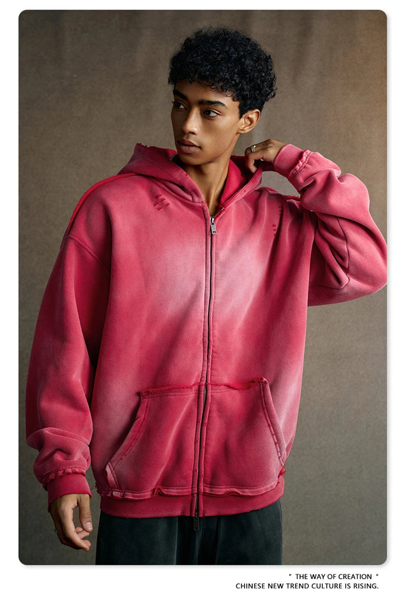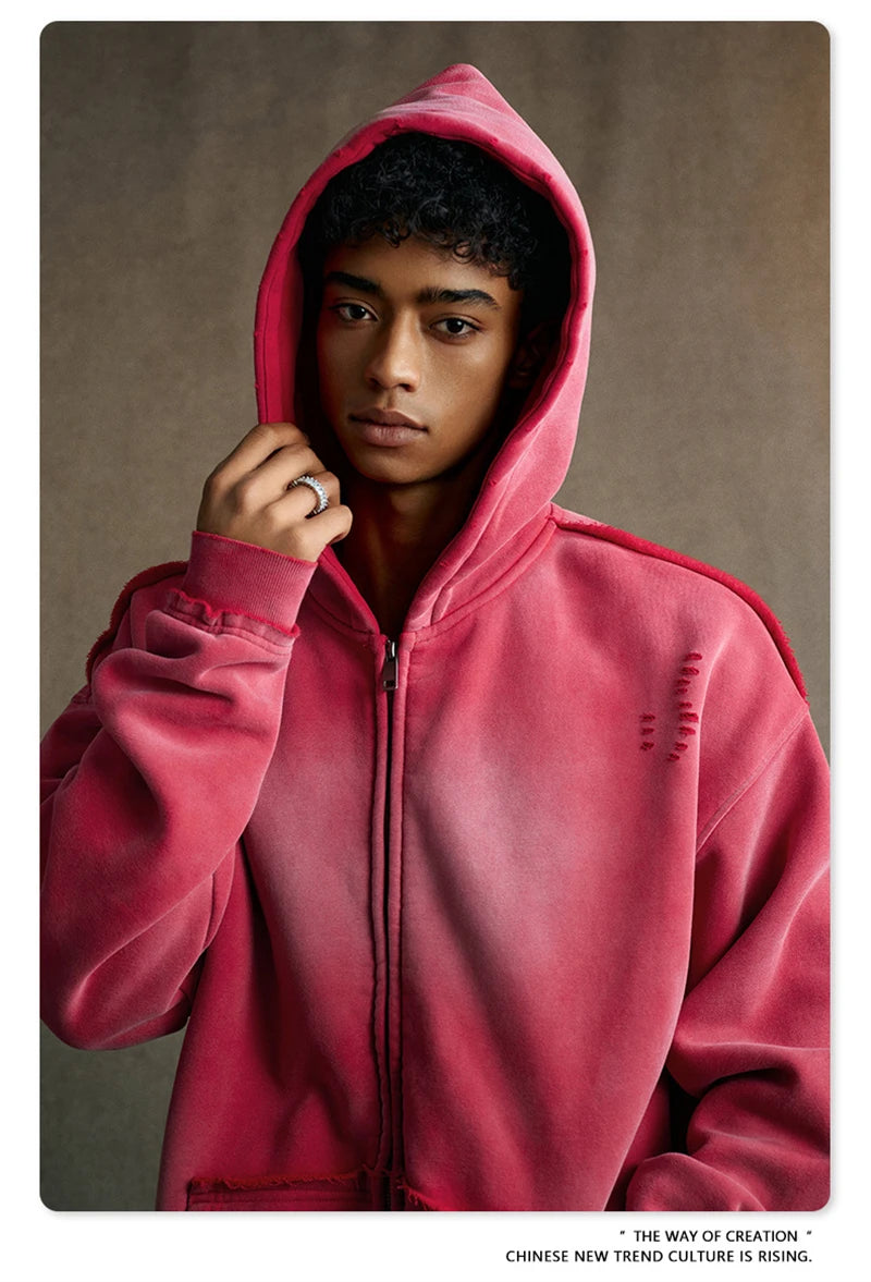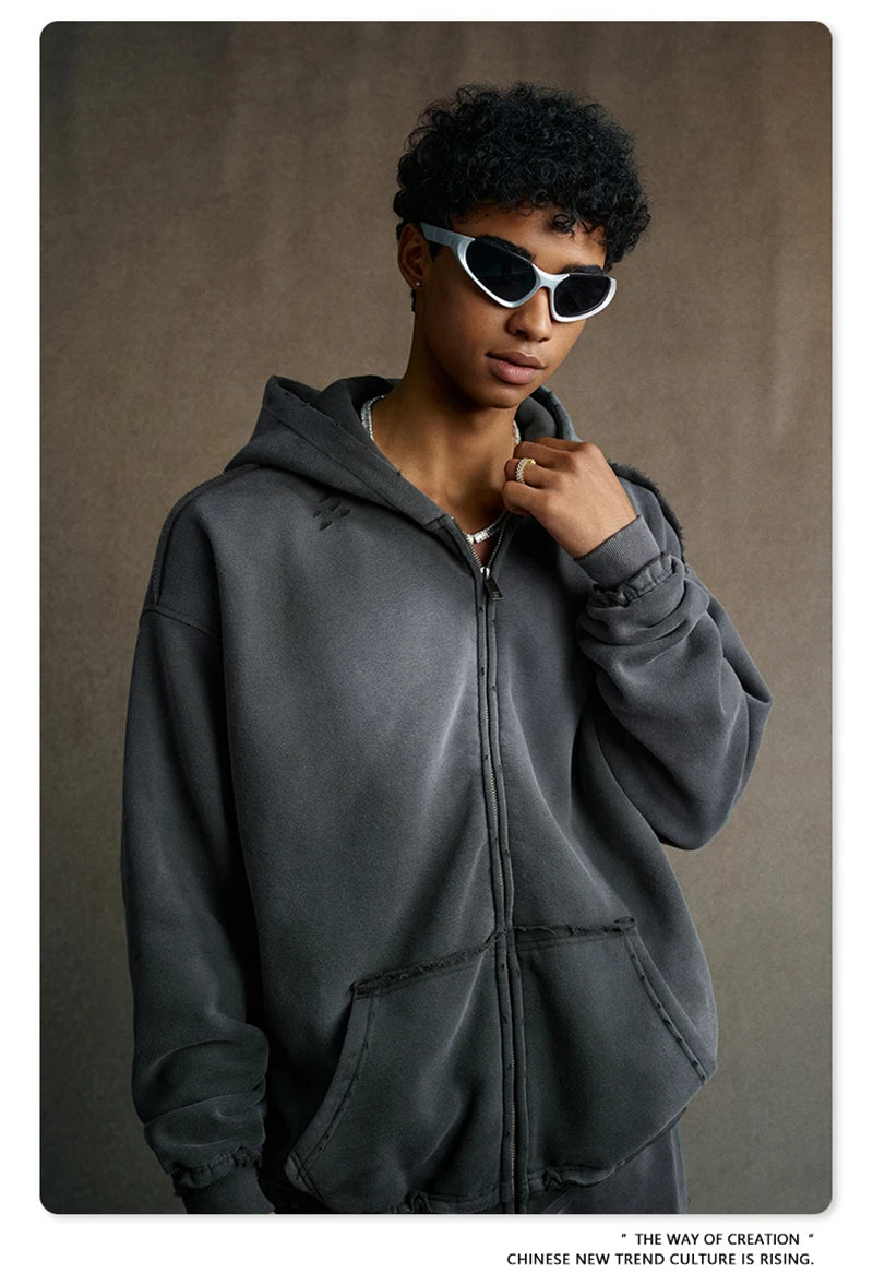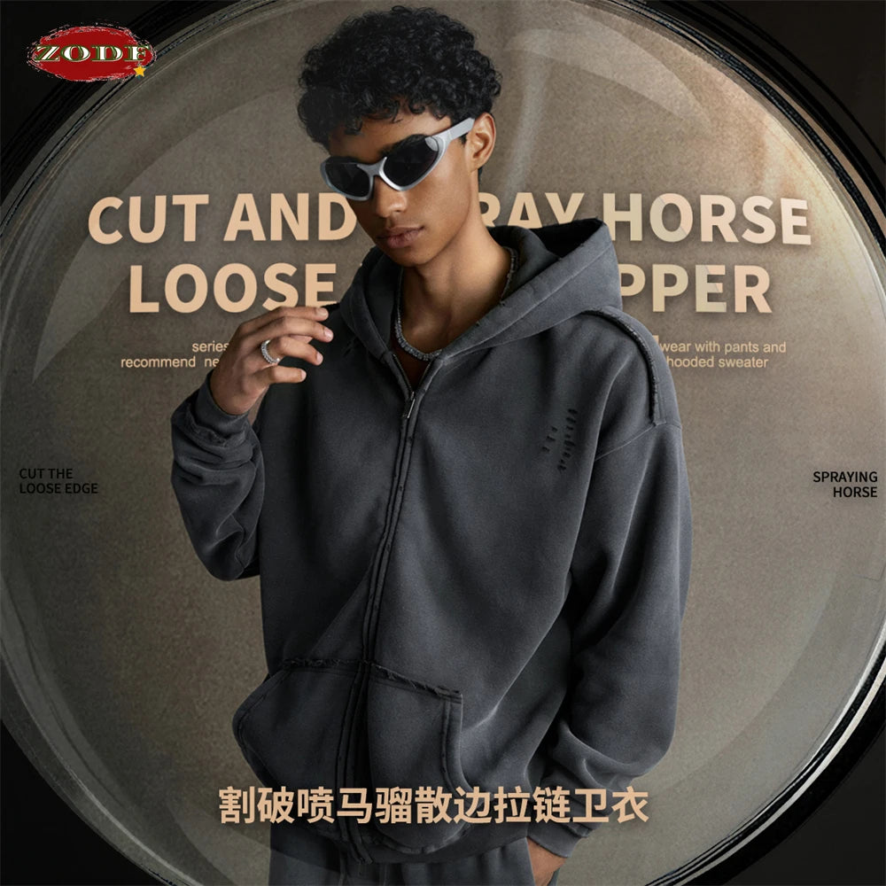 ZODF Retro Winter Men 400gsm Monkey Washed Zipper Hoodie Unisex High Street Loose Edge Ripped Distressed Hooded Pullovers HY1117