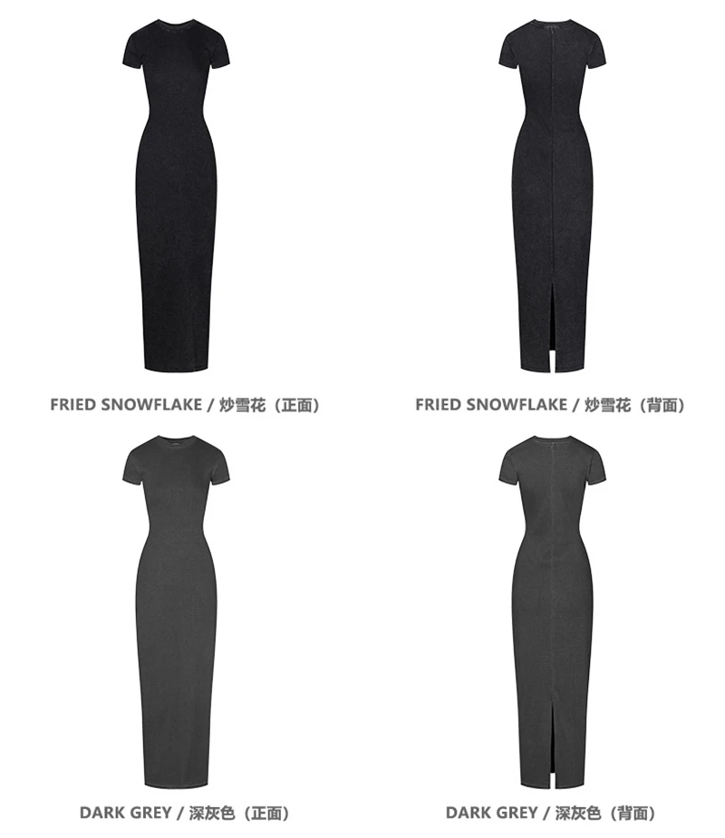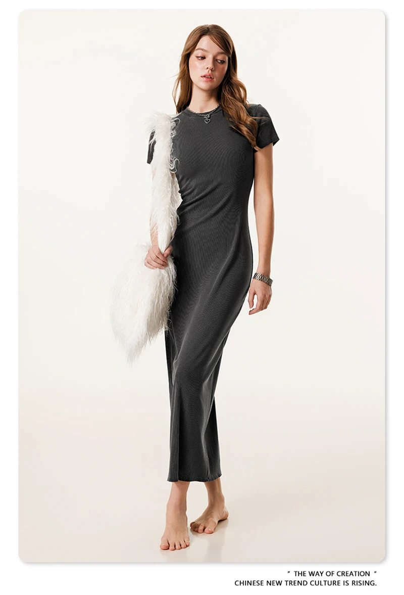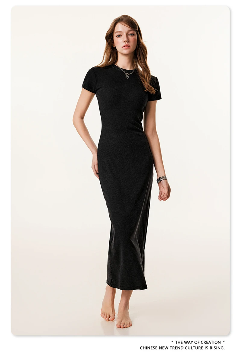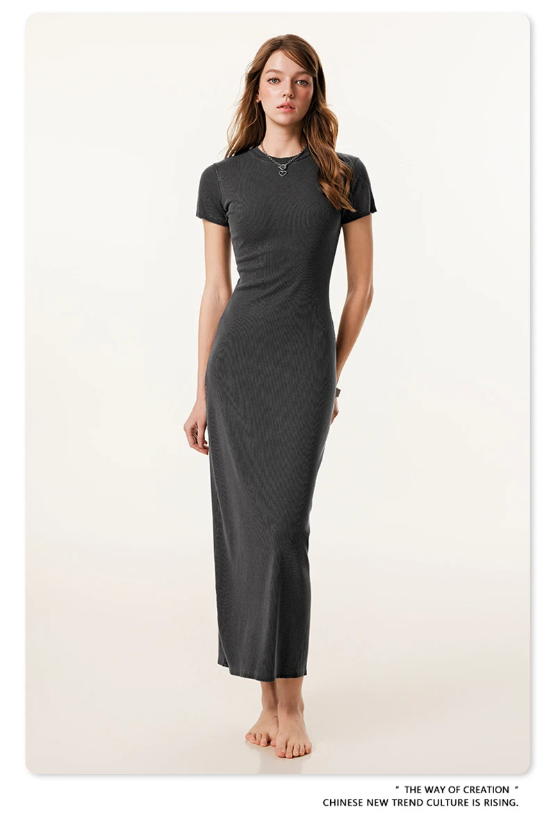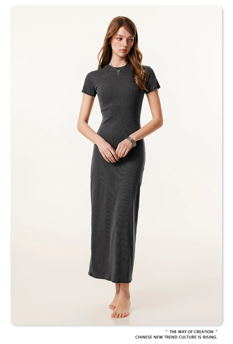 ZODF Sexy 2025 Spring Women 275gsm Long Dress Female Girls O Neck Washed Distressed Slim Slit Fit Dresses HY1008