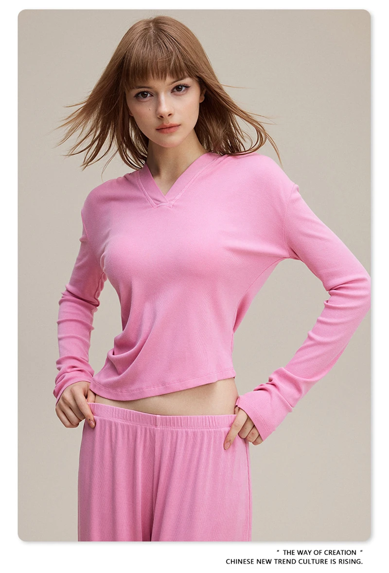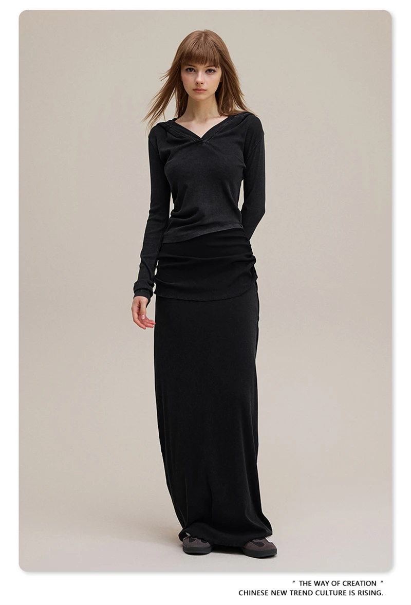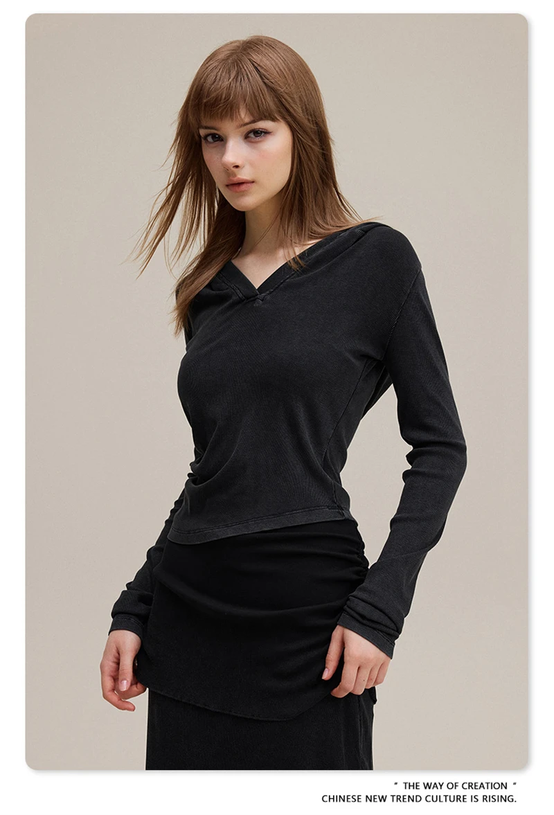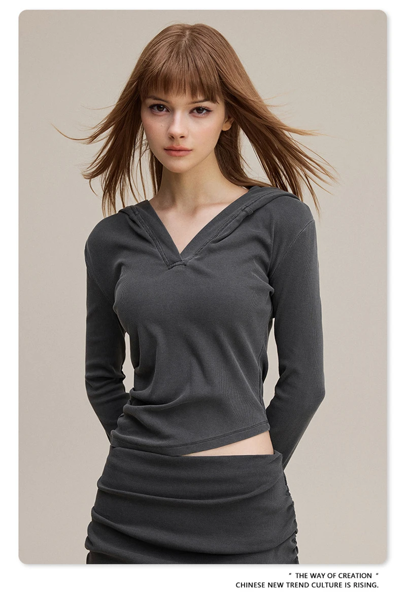 ZODF Sexy Women Autumn Washed 275gsm Hooded T Shirt Ladies Girls Slim Fit Distressed Side Pleated T-Shirts Tees HY1149