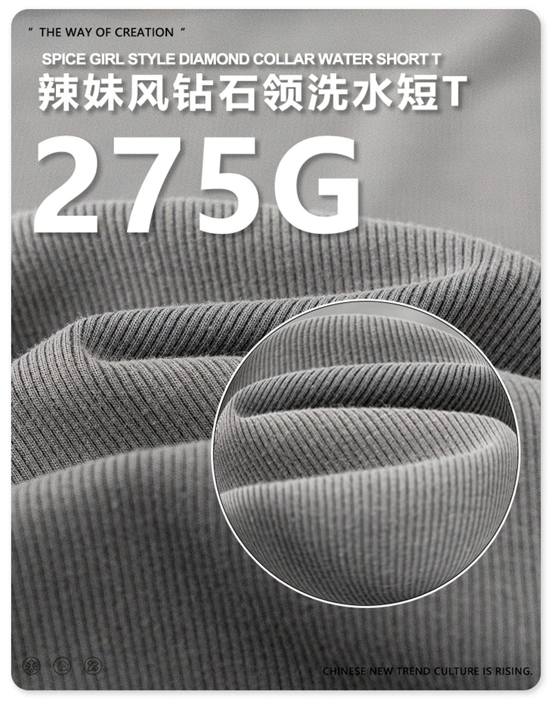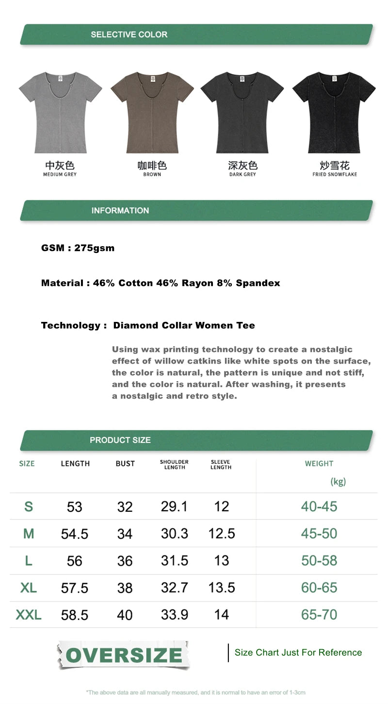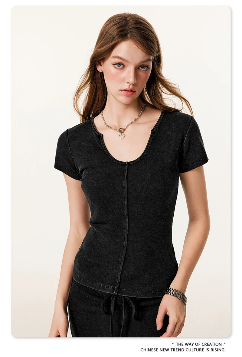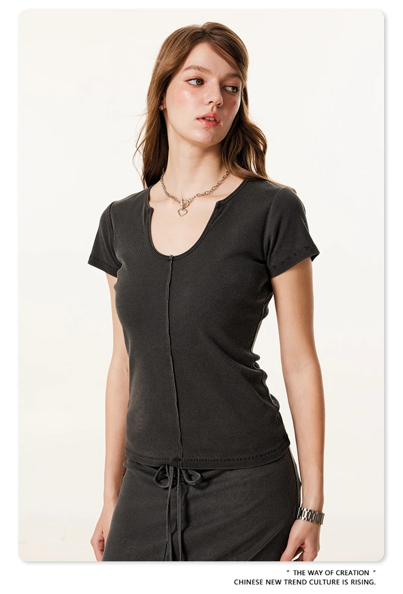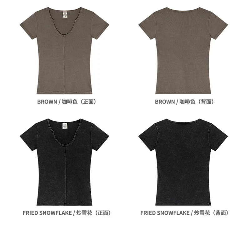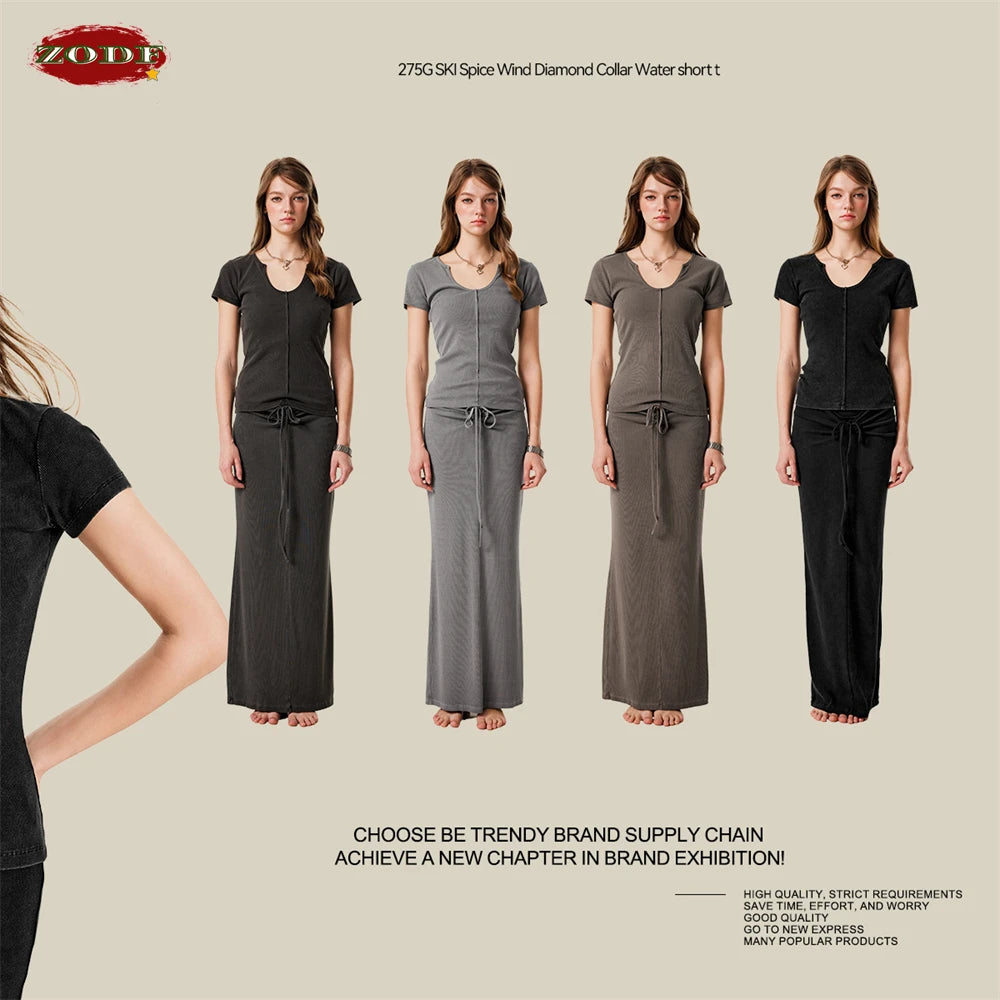 ZODF Women Retro 2025 Summer 275gsm U Collar Washed T-Shirts Hotsweet Girls Sexy Slim Fit T Shirt Brand Tees HY0992
